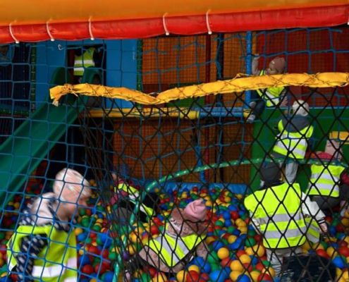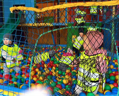 Już od pierwszych chwil mali odkrywcy z radością korzystali z atrakcji na świeżym powietrzu. Plac zabaw tętnił śmiechem, a kolorowy zamek z kulkami stał się areną beztroskich harców. Dzieci z entuzjazmem poznawały mieszkańców zagrody — karmiły kozy, alpaki i osiołki, ucząc się przy tym troski i delikatności wobec zwierząt.