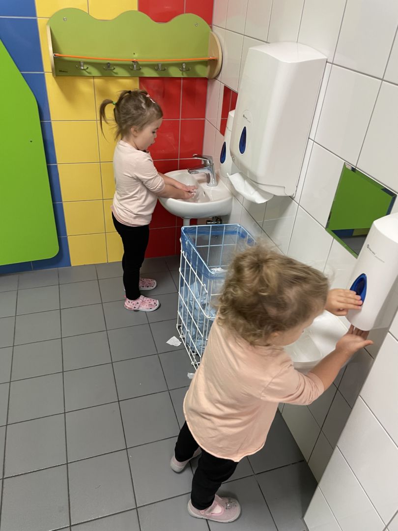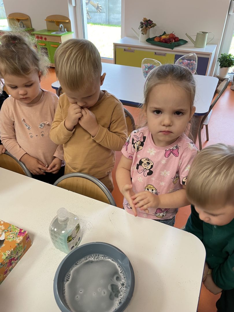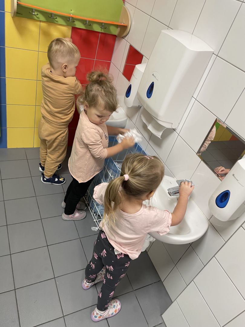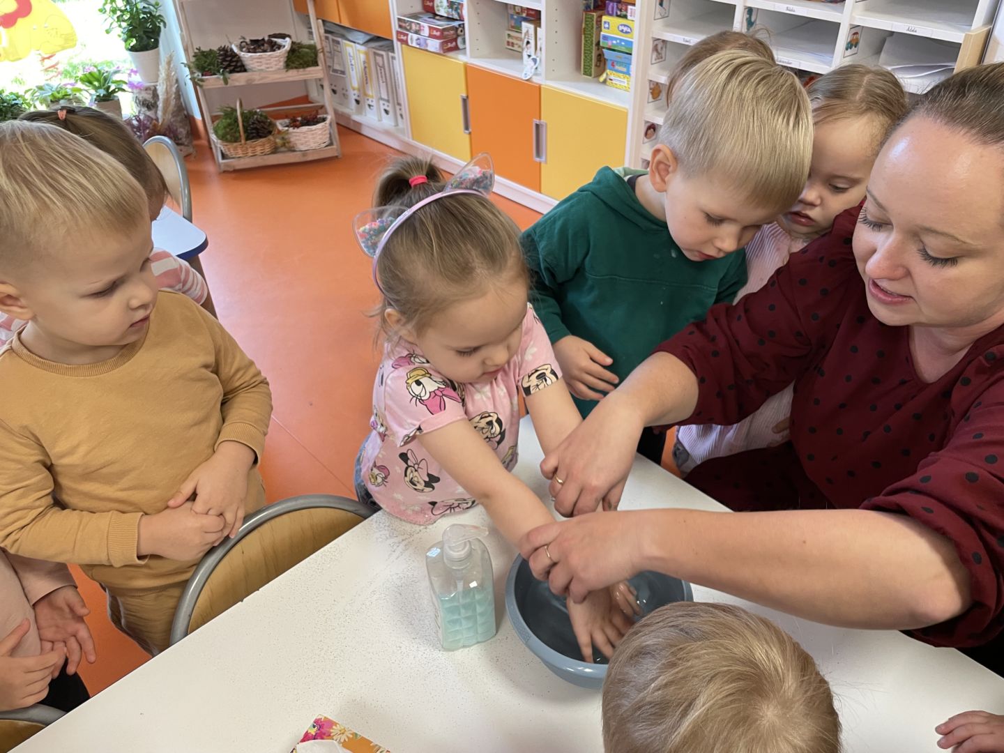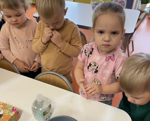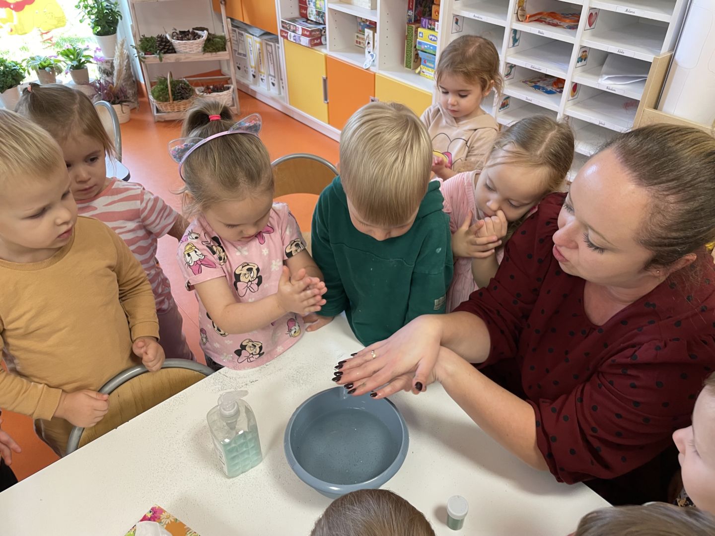 „Czyste rączki mamy” – Dzieci, bawiąc się brokatowymi „wirusami”, przekonały się, jak łatwo rozprzestrzeniają się zarazki i jak ważne jest dokładne mycie rąk, by skutecznie się ich pozbyć.