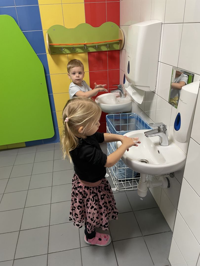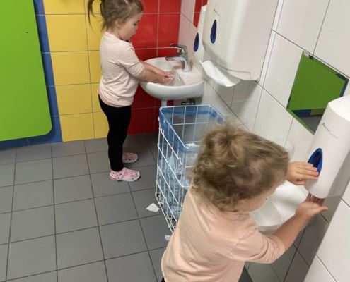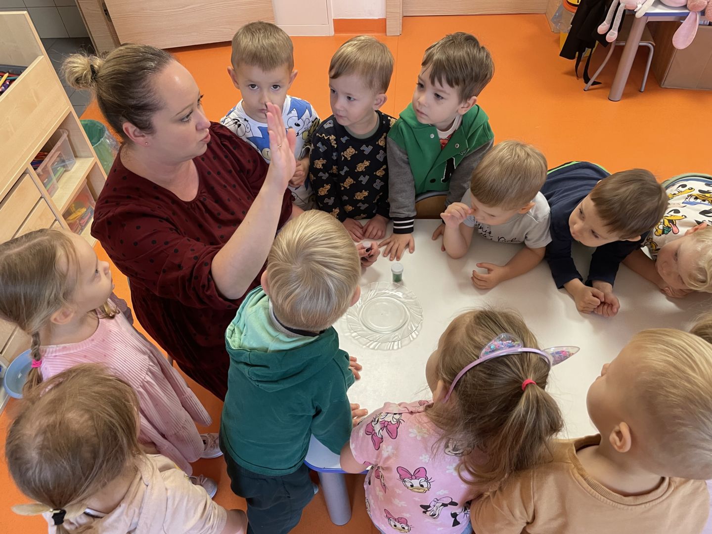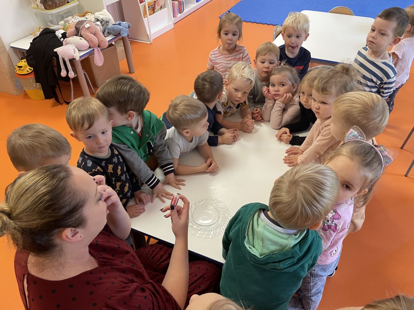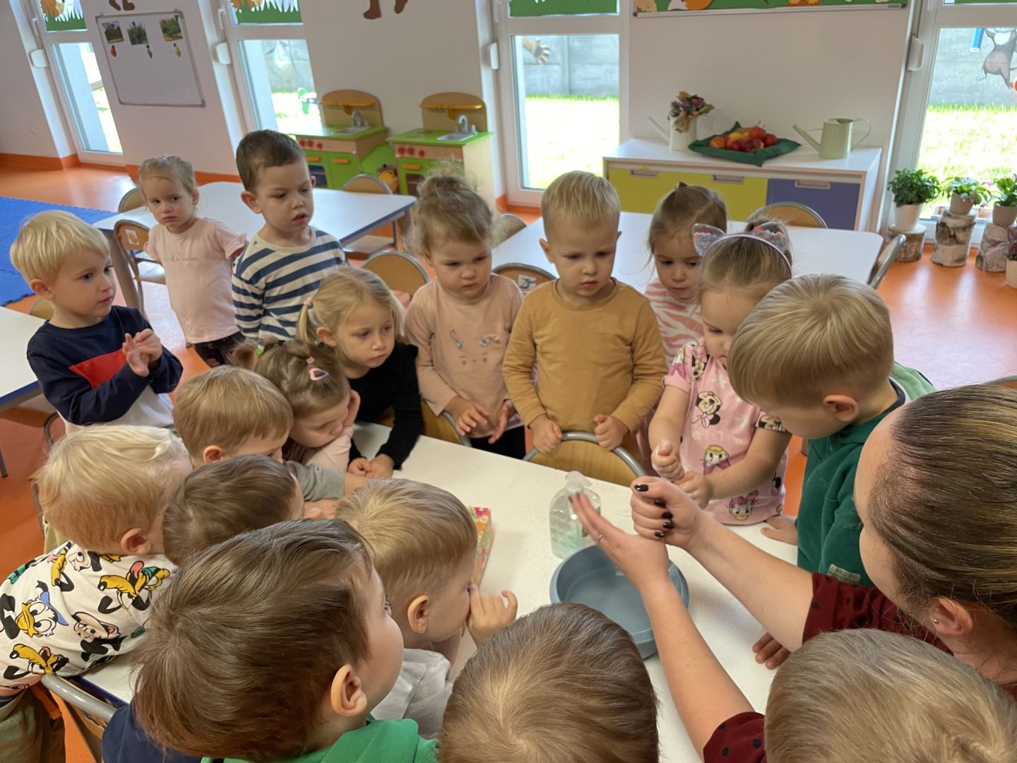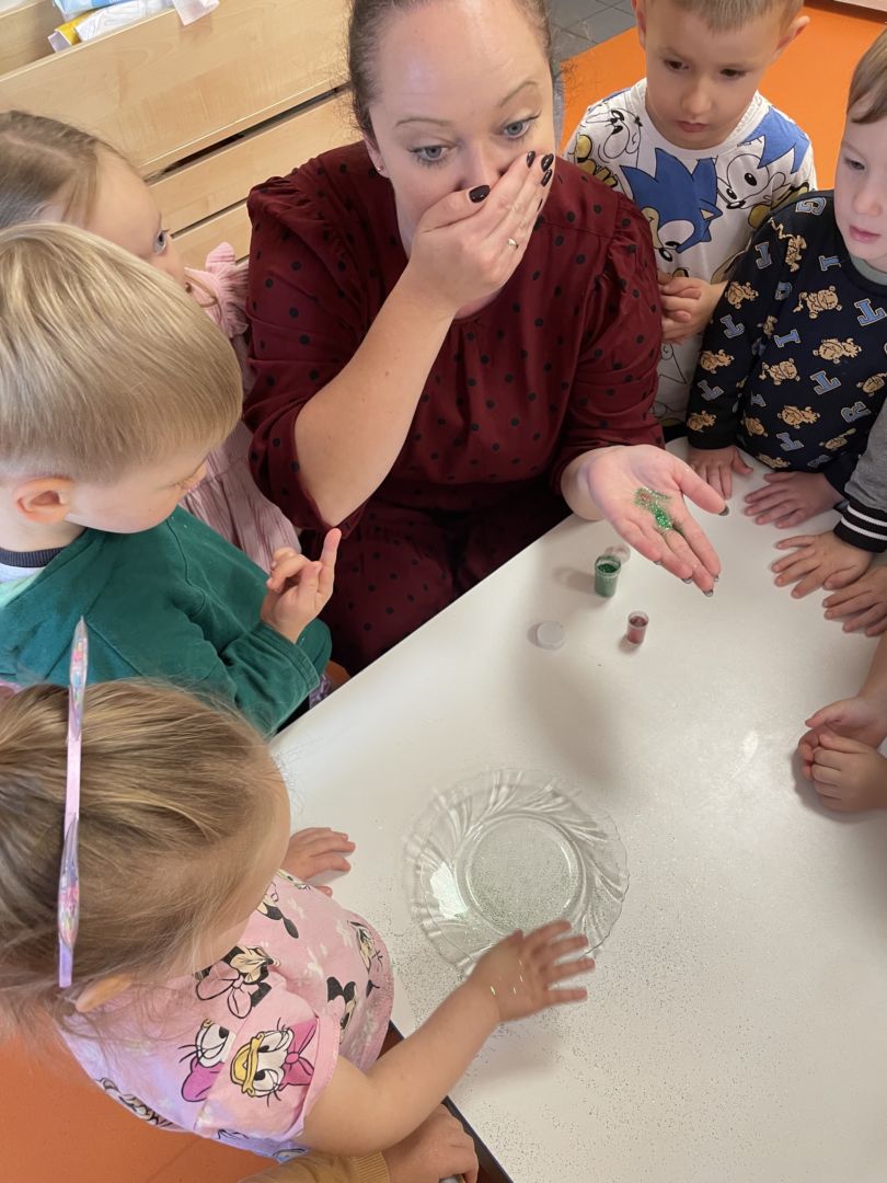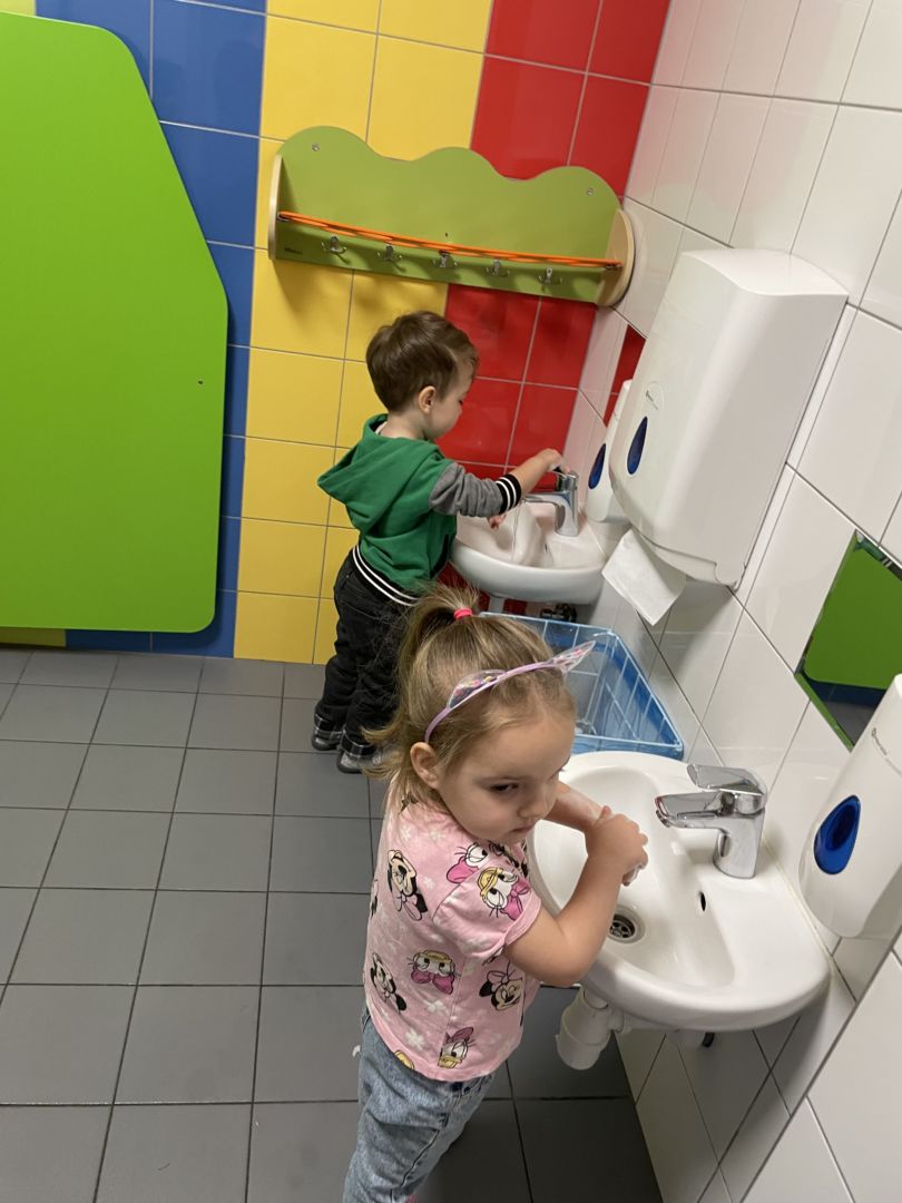 „Czyste rączki mamy” – Dzieci, bawiąc się brokatowymi „wirusami”, przekonały się, jak łatwo rozprzestrzeniają się zarazki i jak ważne jest dokładne mycie rąk, by skutecznie się ich pozbyć.