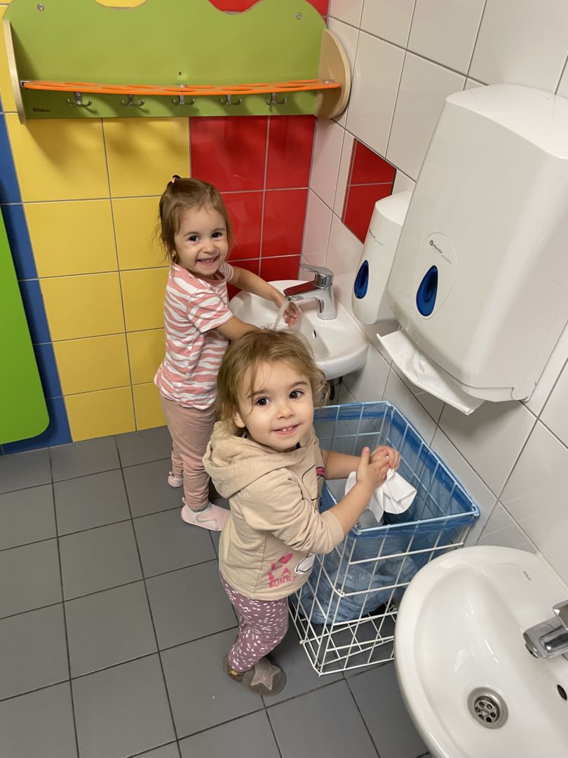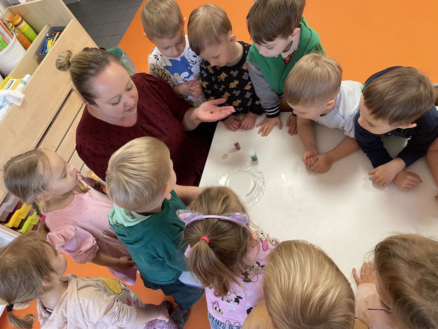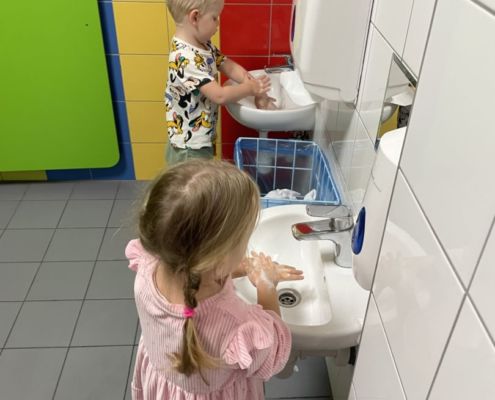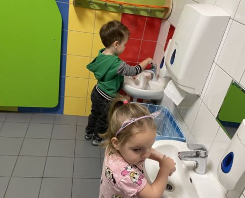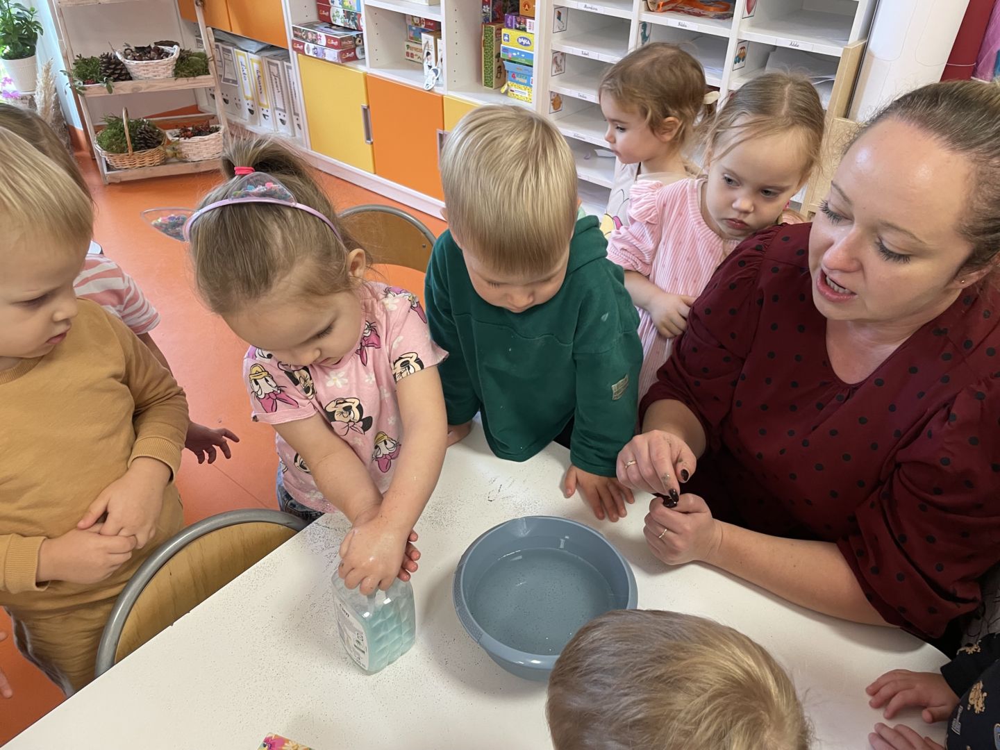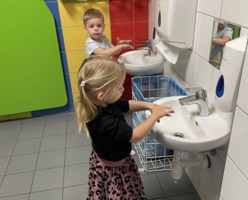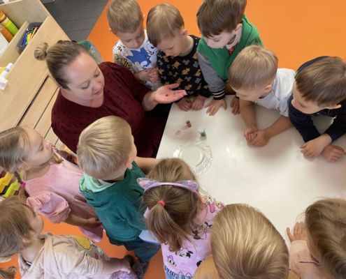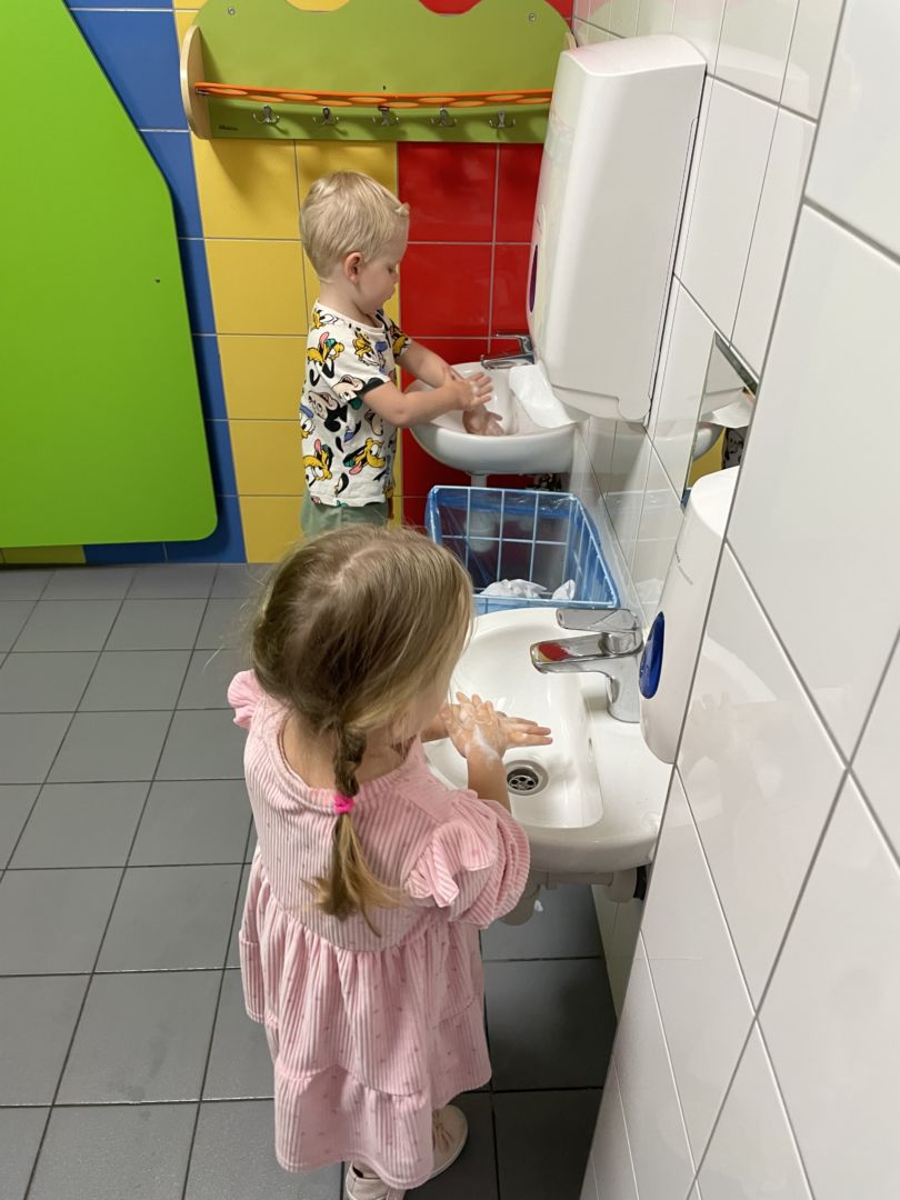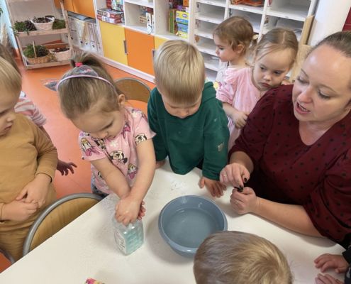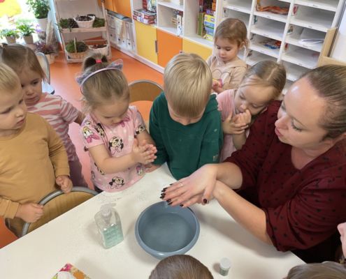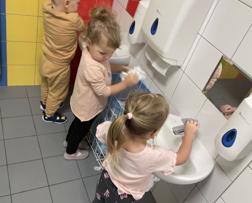„Czyste rączki mamy” – Dzieci, bawiąc się brokatowymi „wirusami”, przekonały się, jak łatwo rozprzestrzeniają się zarazki i jak ważne jest dokładne mycie rąk, by skutecznie się ich pozbyć.