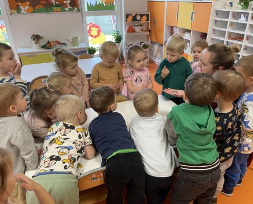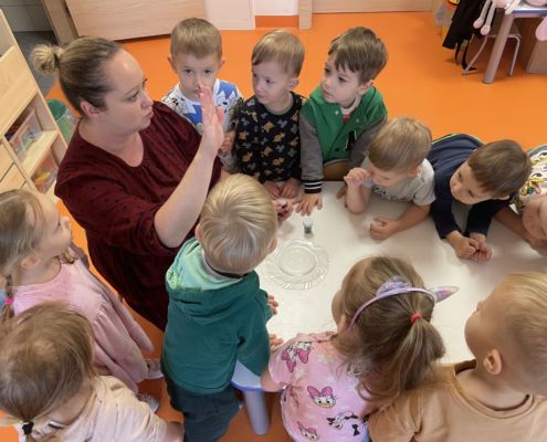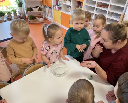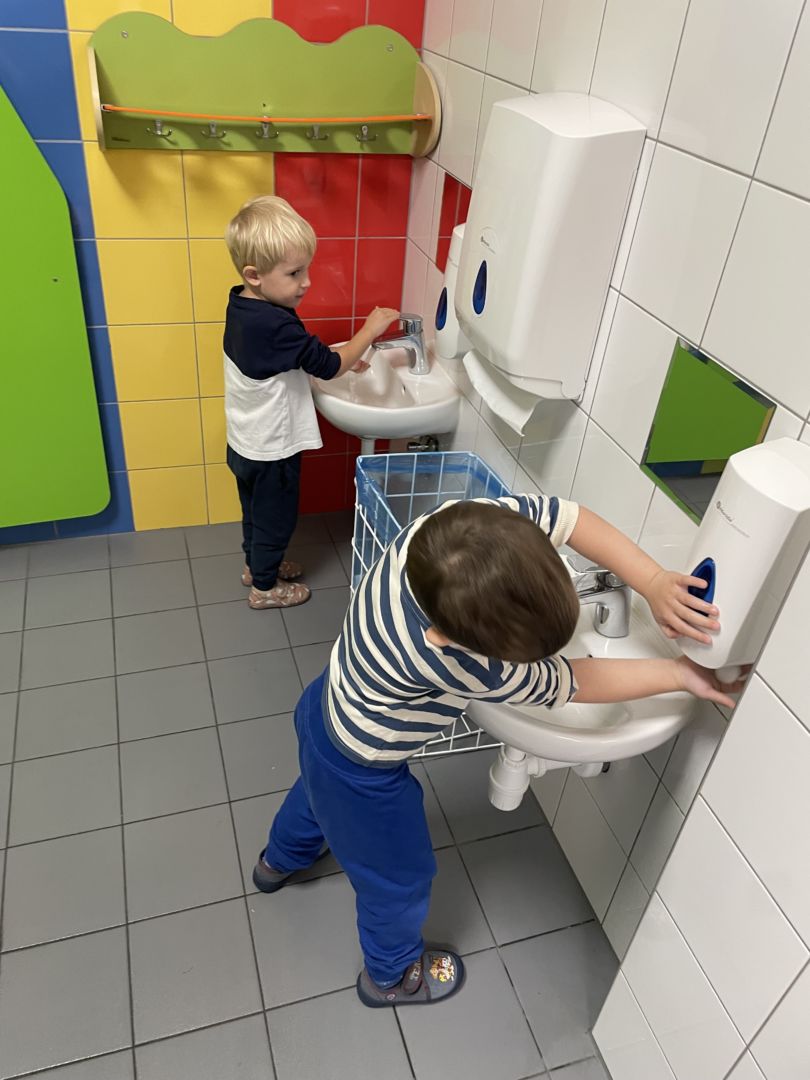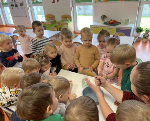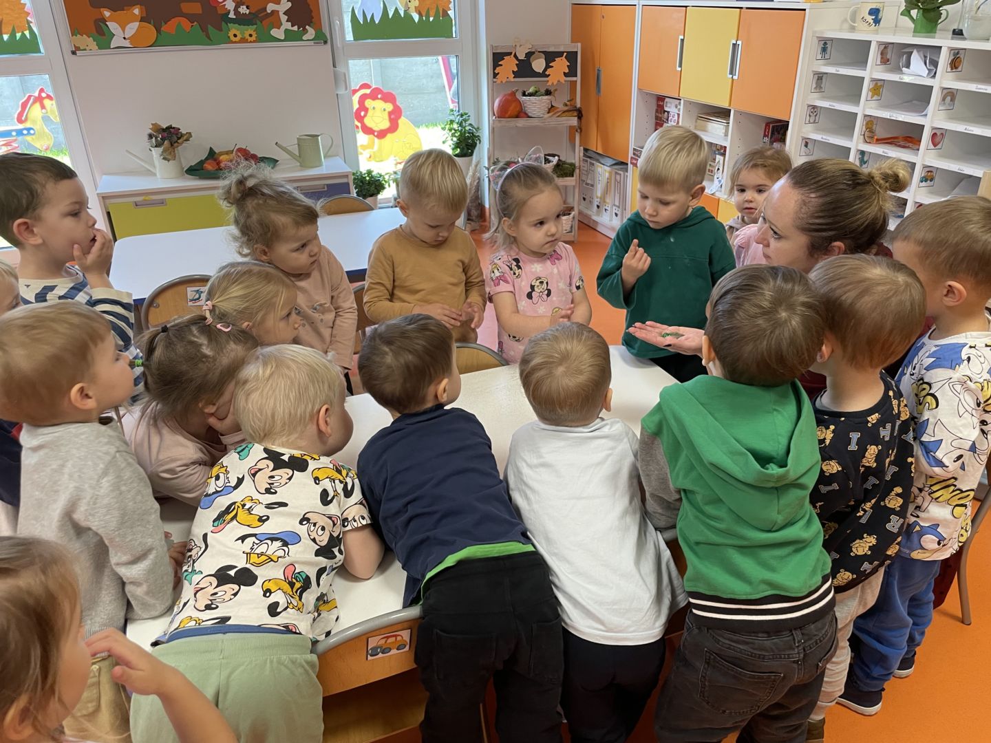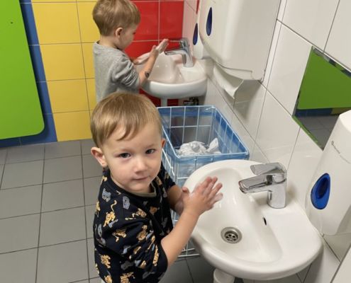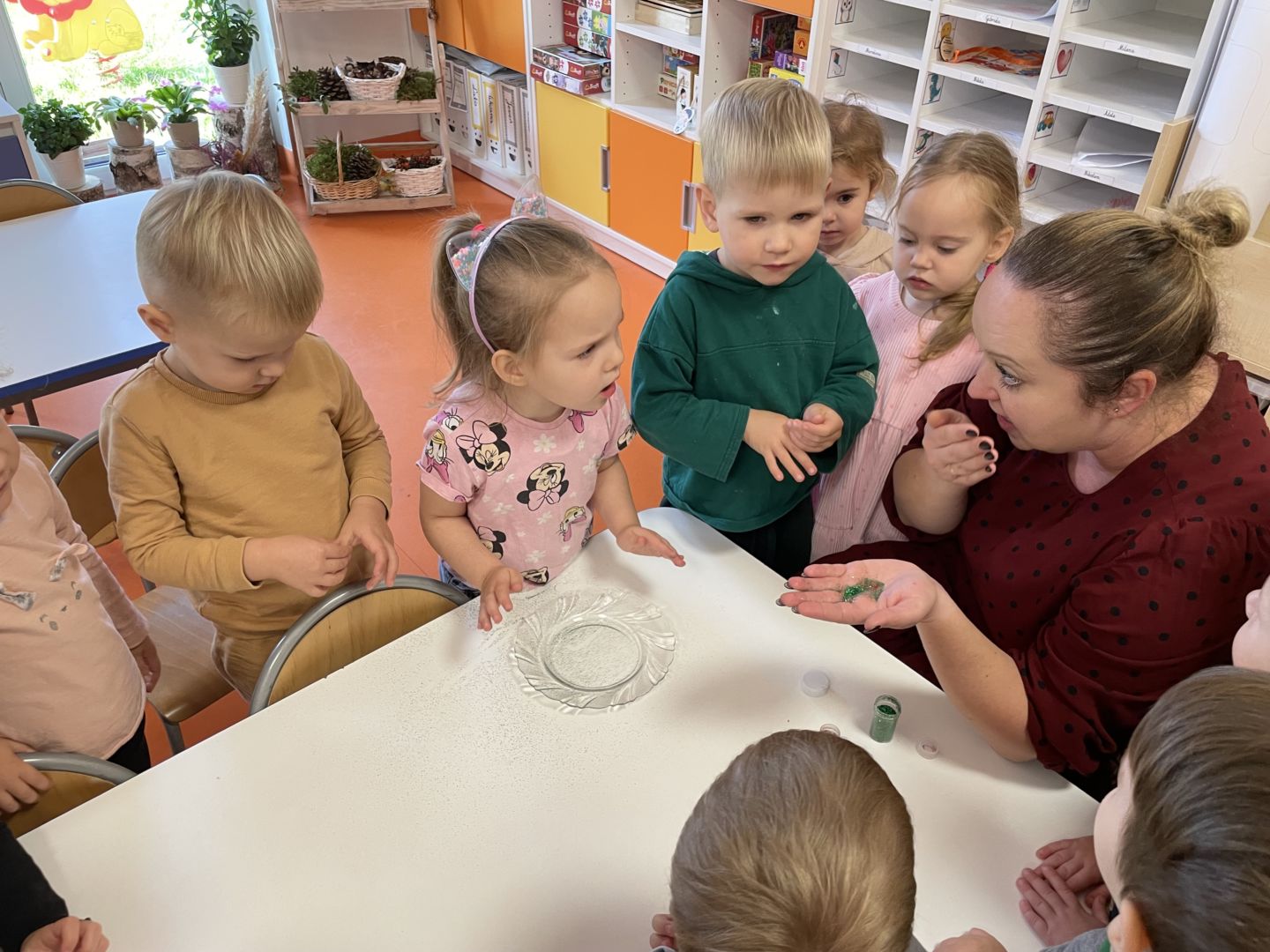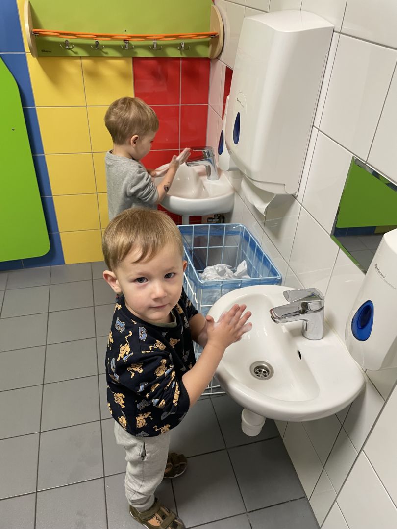 „Czyste rączki mamy” – Dzieci, bawiąc się brokatowymi „wirusami”, przekonały się, jak łatwo rozprzestrzeniają się zarazki i jak ważne jest dokładne mycie rąk, by skutecznie się ich pozbyć.