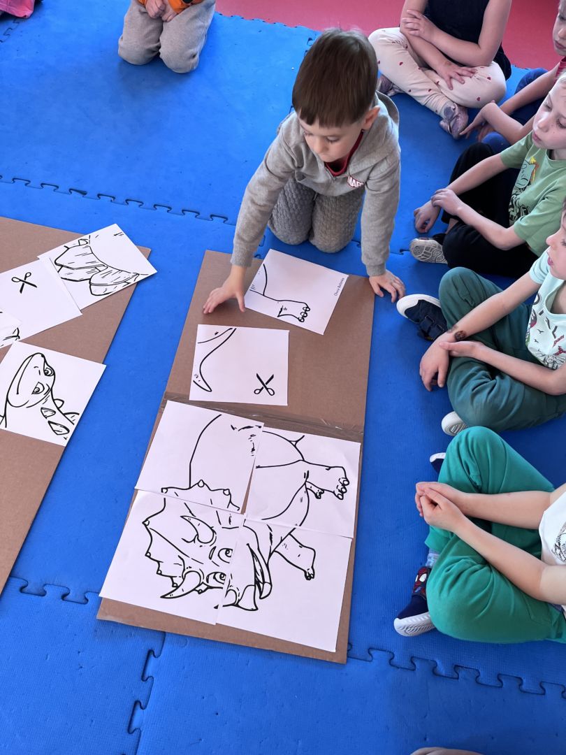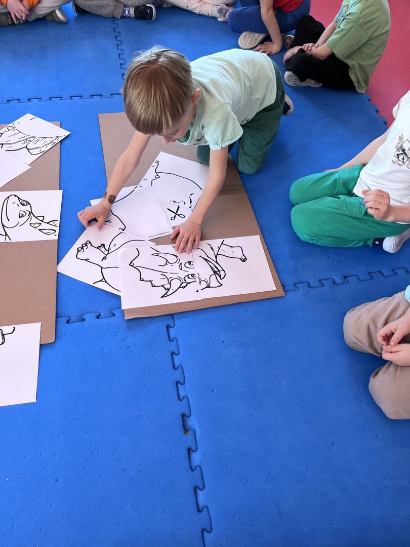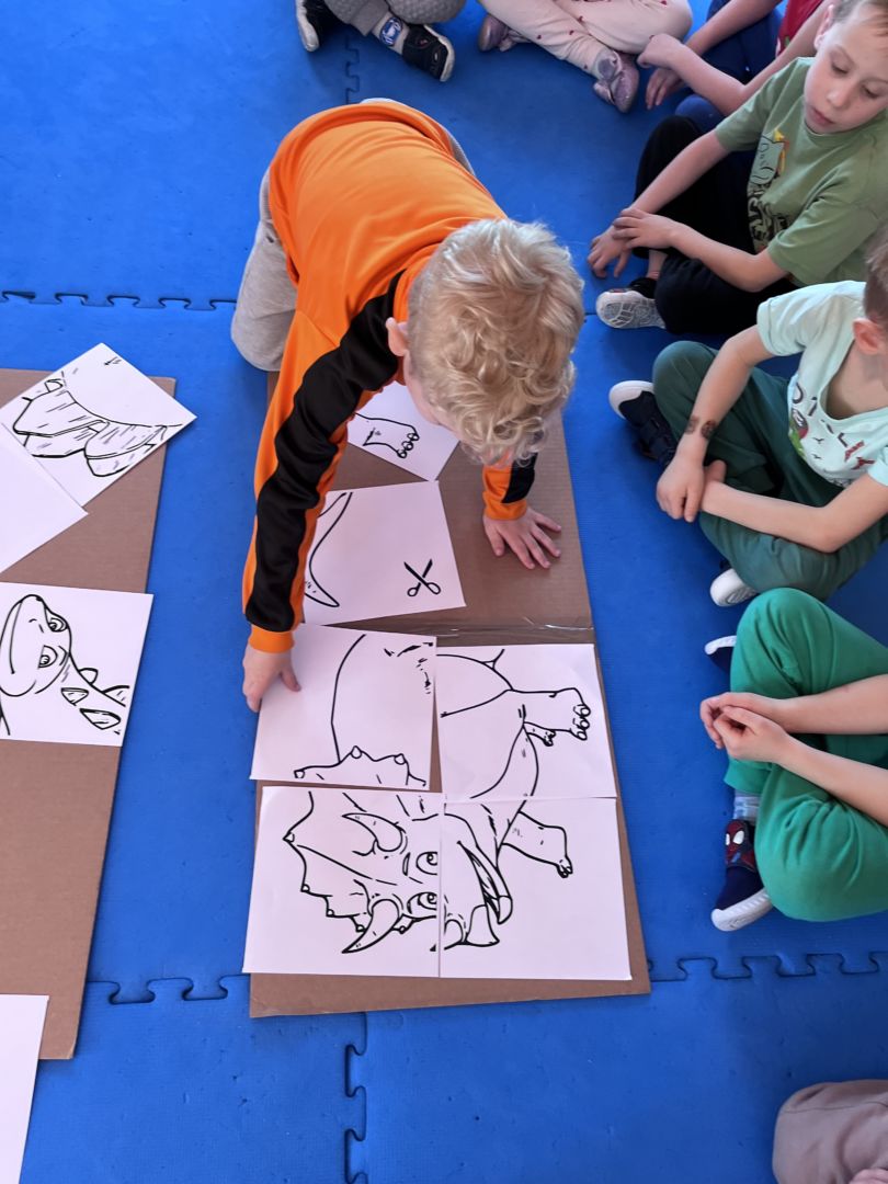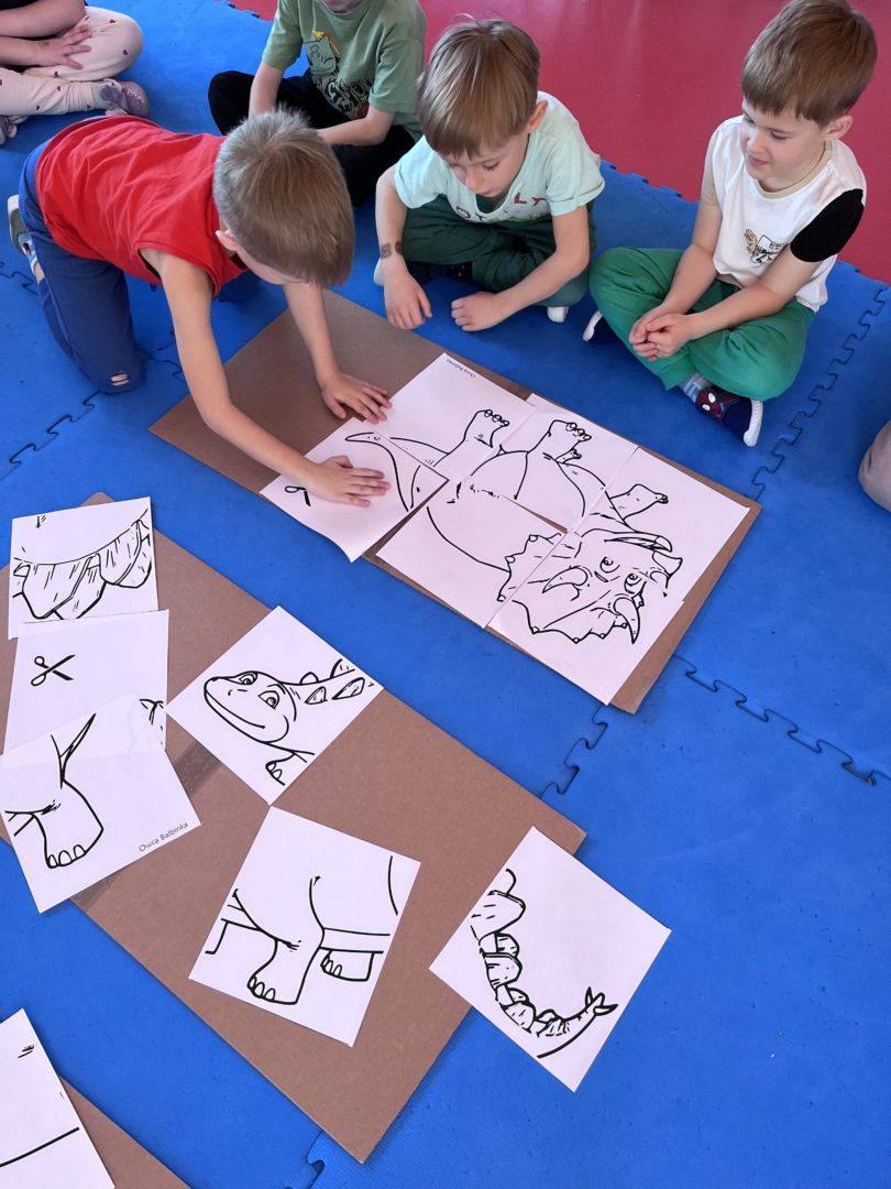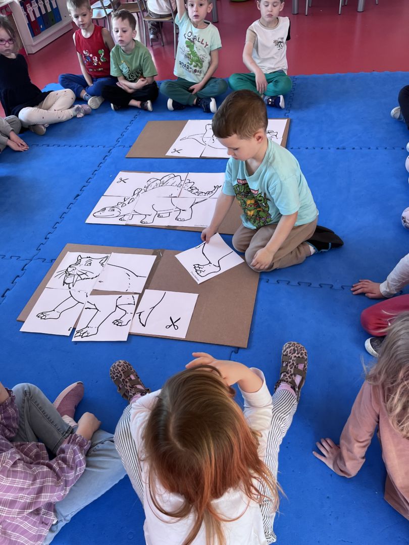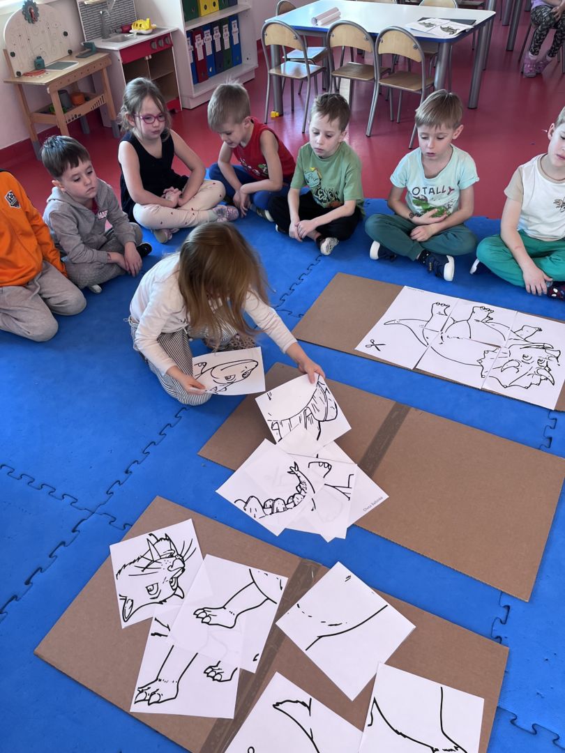 W tym tygodniu zgłębialiśmy wiedzę na temat prehistorycznych olbrzymów. Wykonywaliśmy pracę plastyczną oraz bawiliśmy się gipsem (w archeologów). Składaliśmy też obrazek z części.