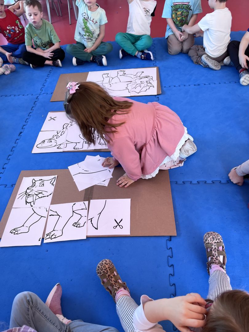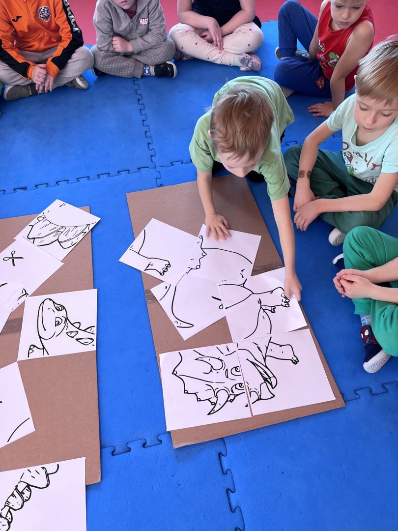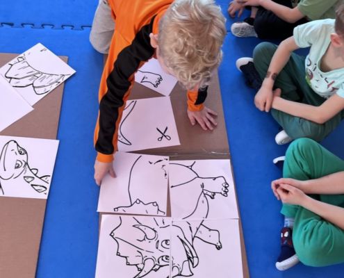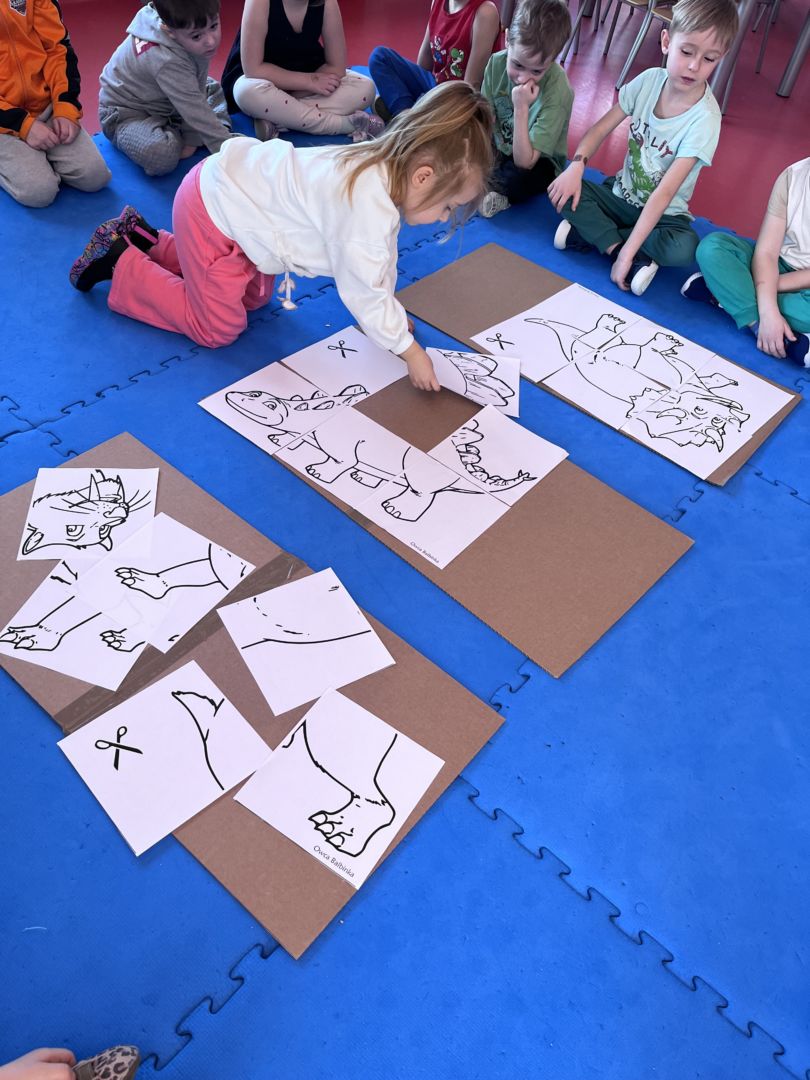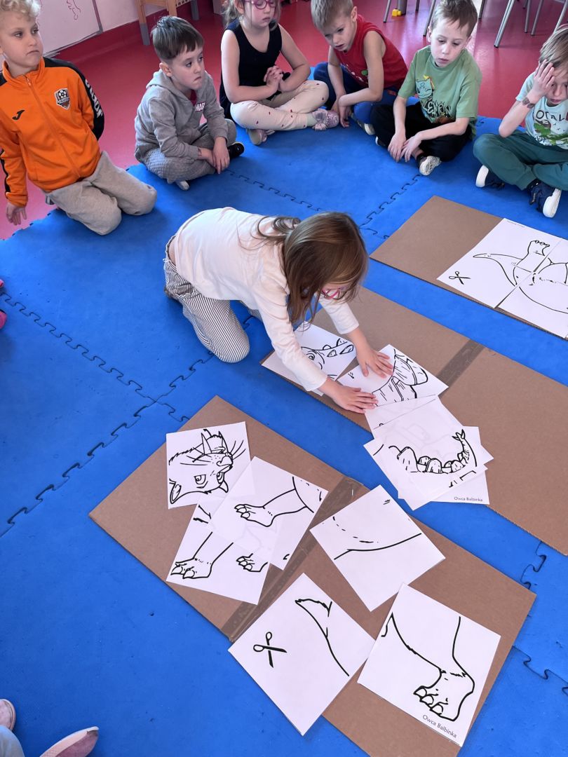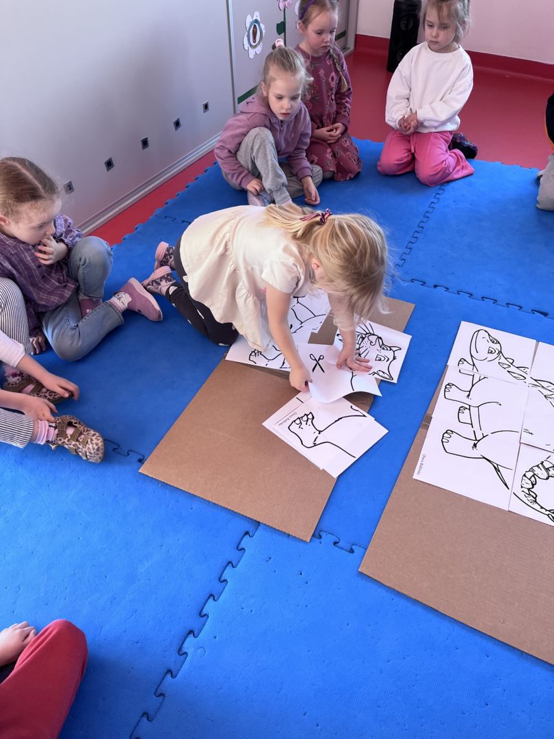 W tym tygodniu zgłębialiśmy wiedzę na temat prehistorycznych olbrzymów. Wykonywaliśmy pracę plastyczną oraz bawiliśmy się gipsem (w archeologów). Składaliśmy też obrazek z części.