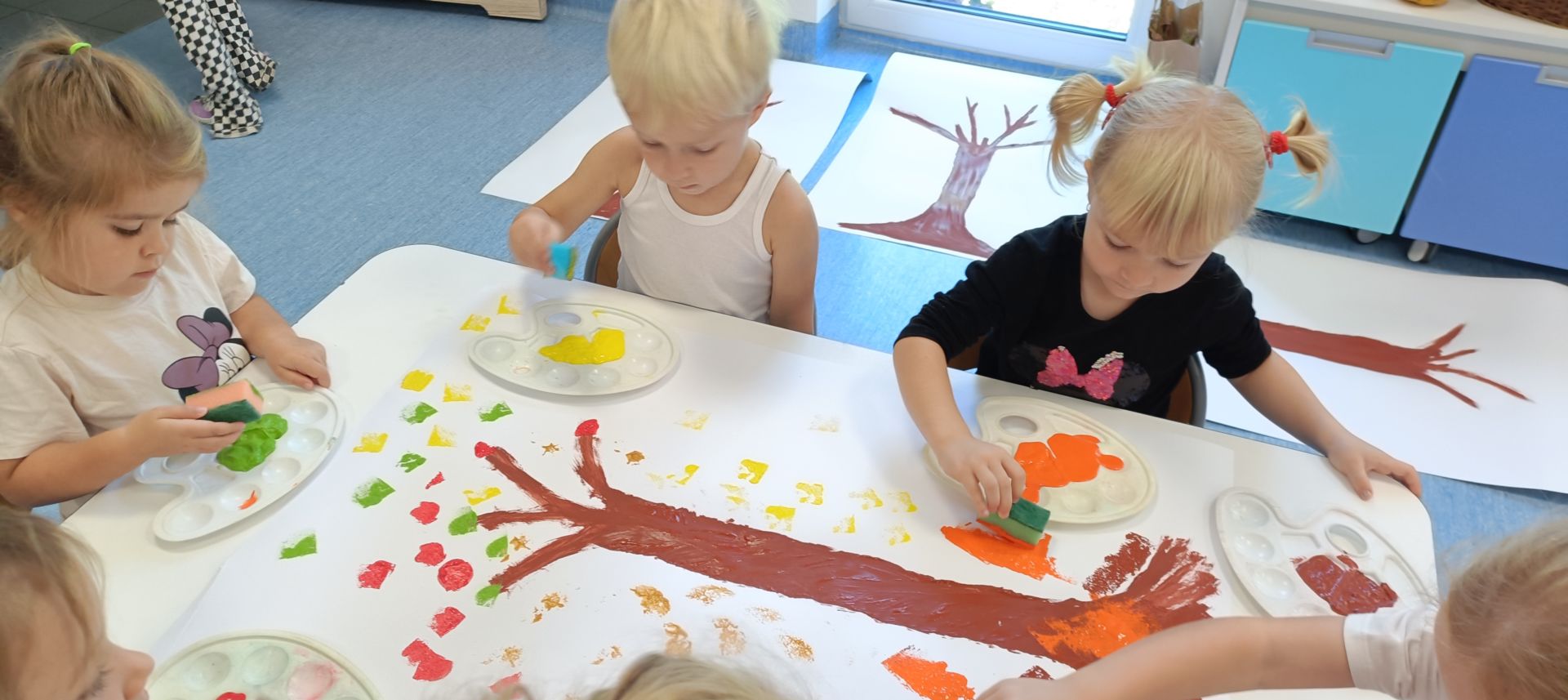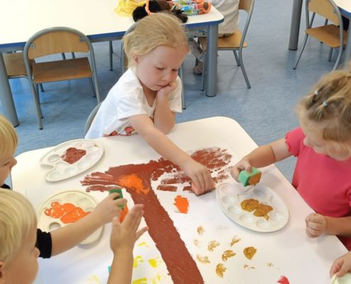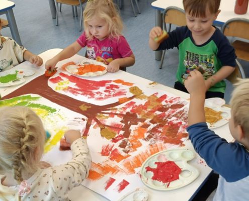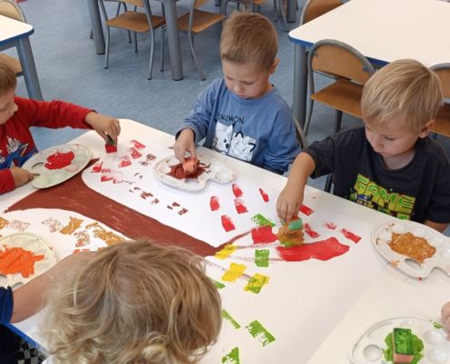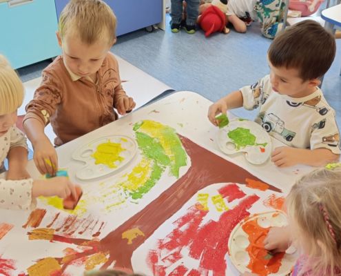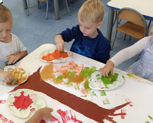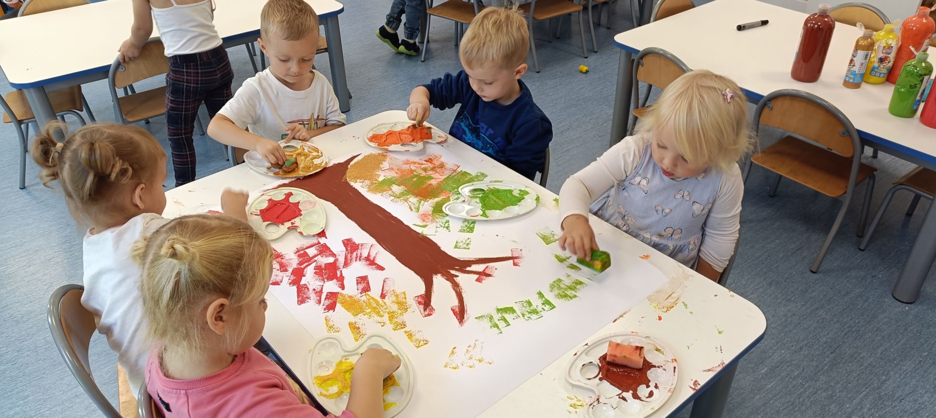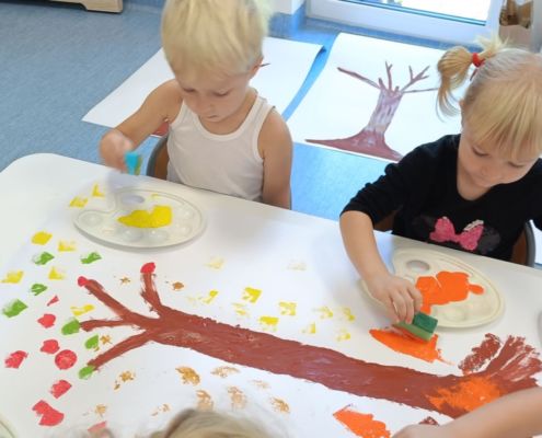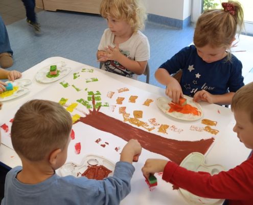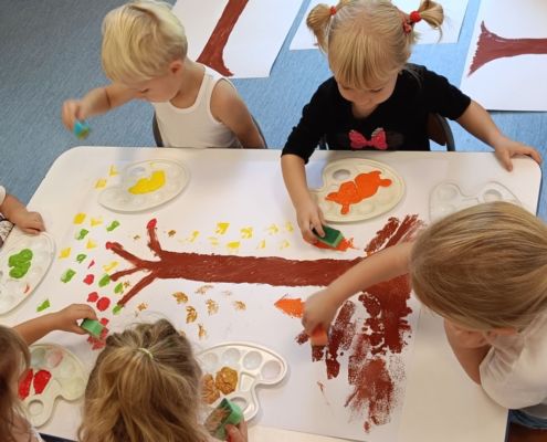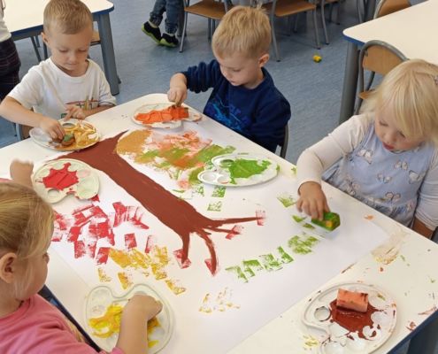 Jesienne drzewa – praca plastyczna wykonana techniką: stemplowanie. Praca w małych grupach.