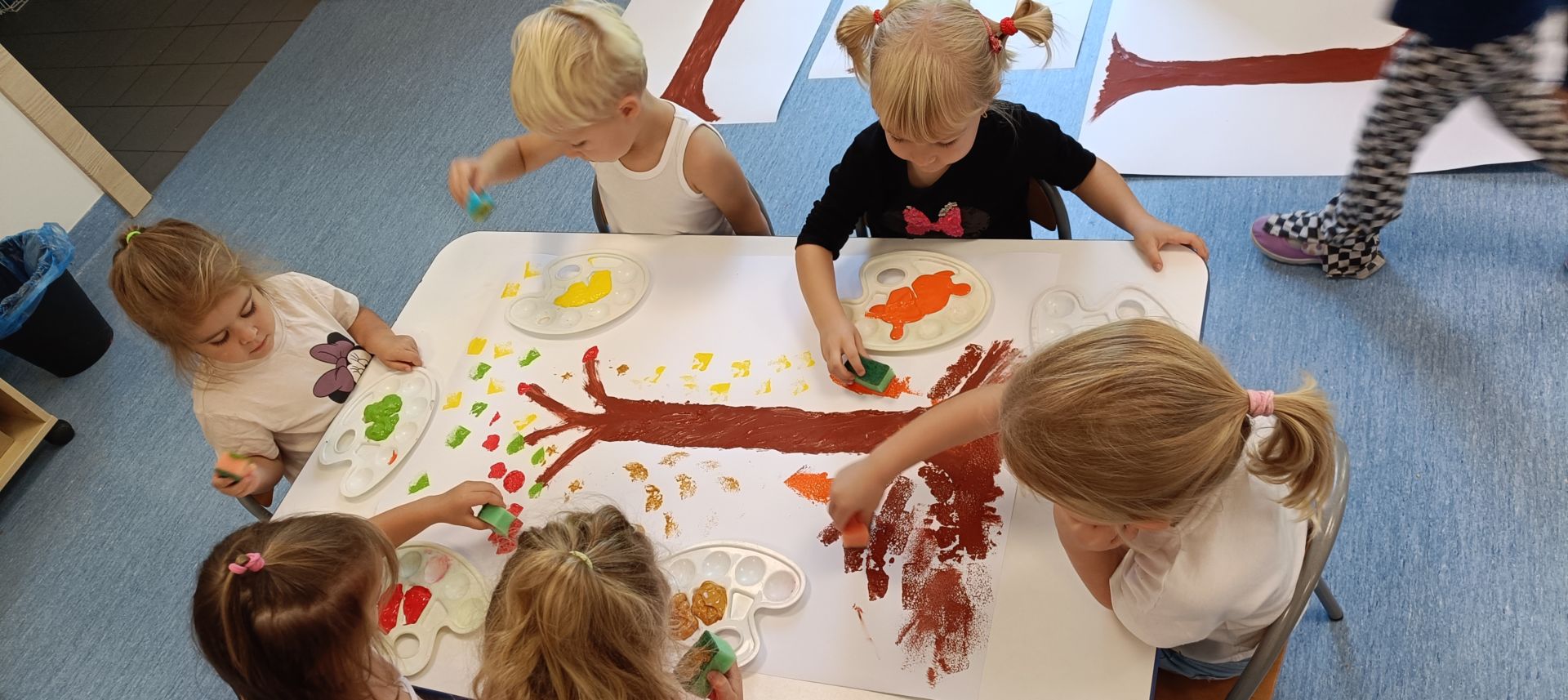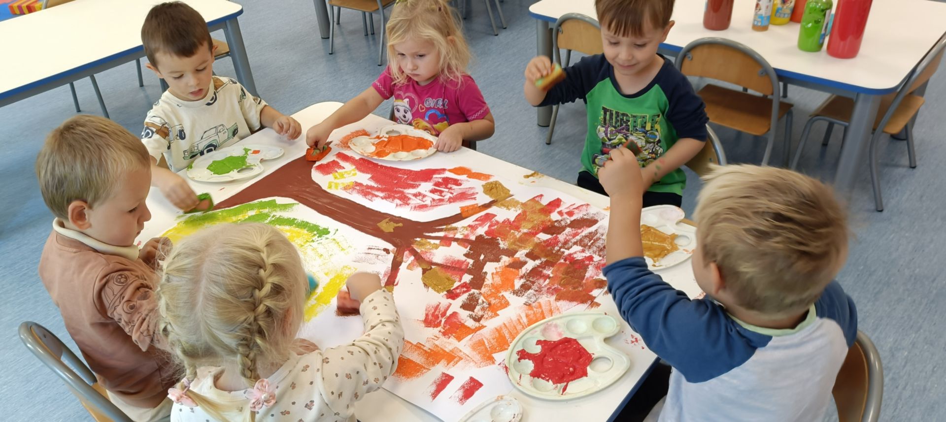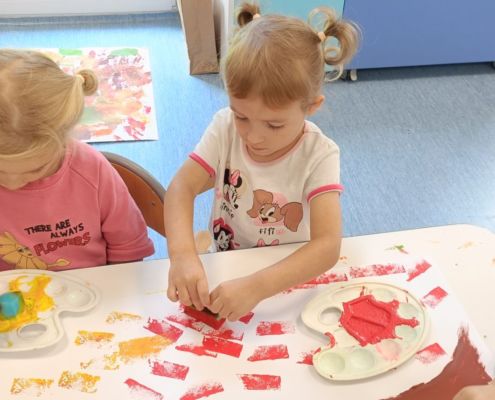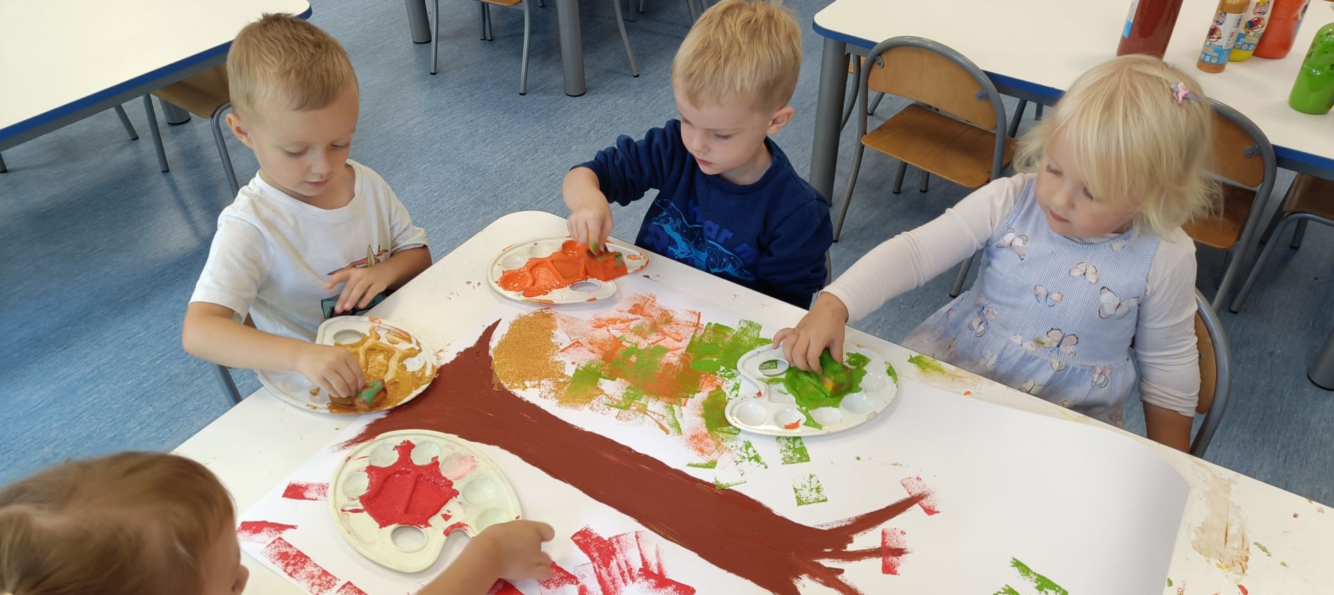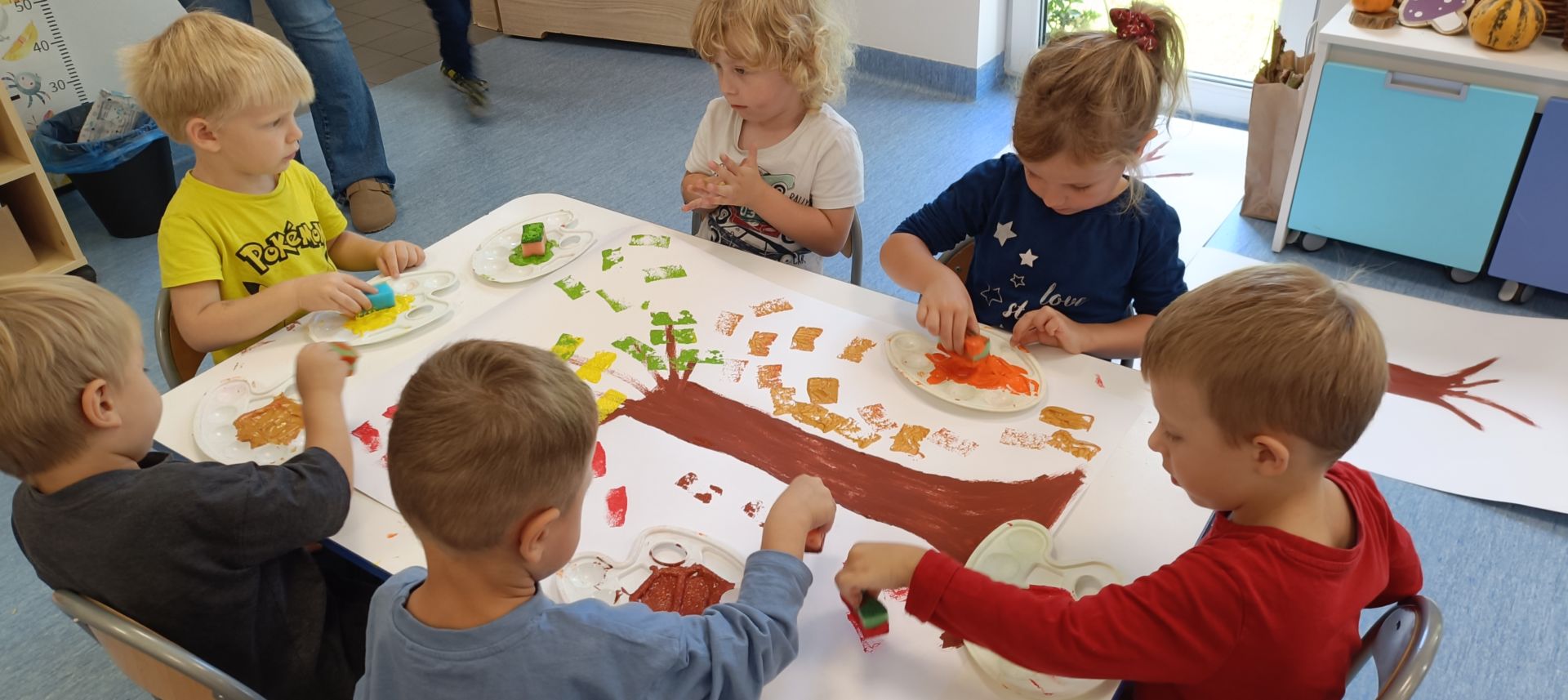 Jesienne drzewa – praca plastyczna wykonana techniką: stemplowanie. Praca w małych grupach.