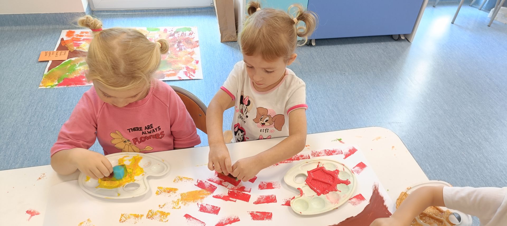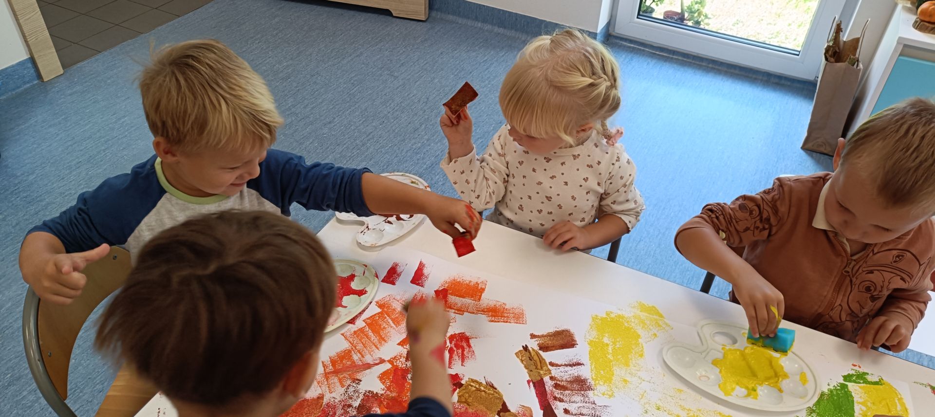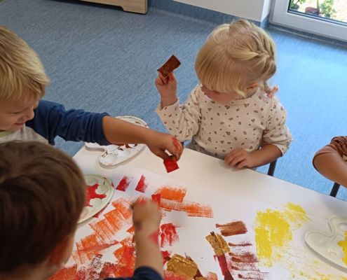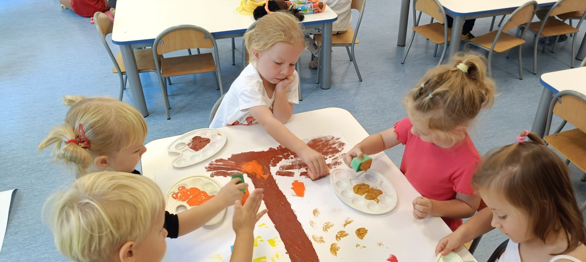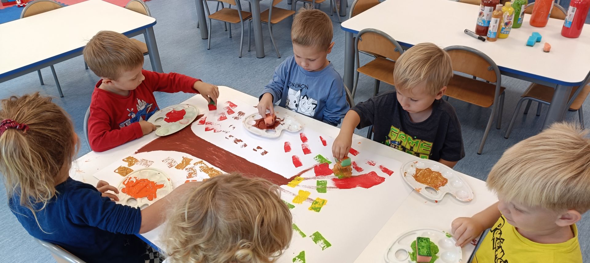 Jesienne drzewa – praca plastyczna wykonana techniką: stemplowanie. Praca w małych grupach.
