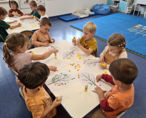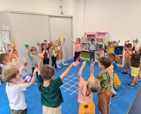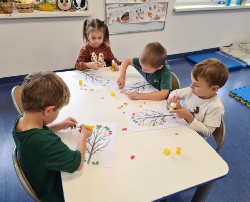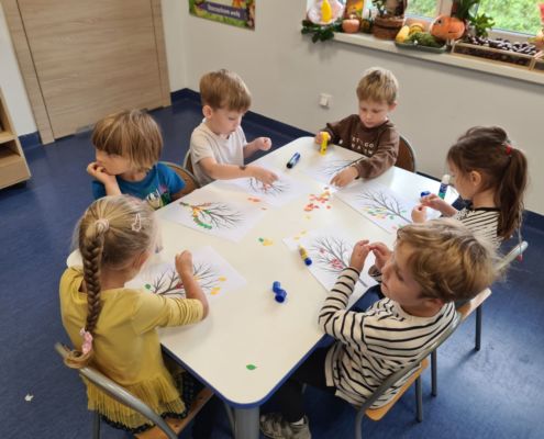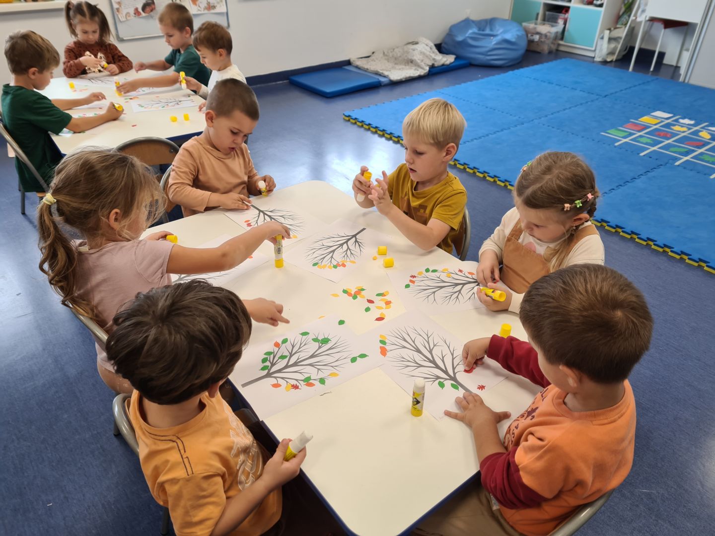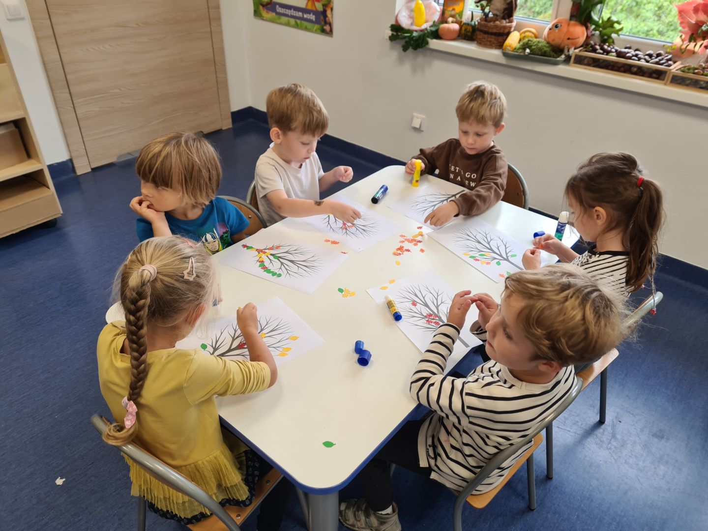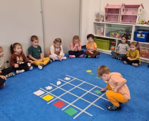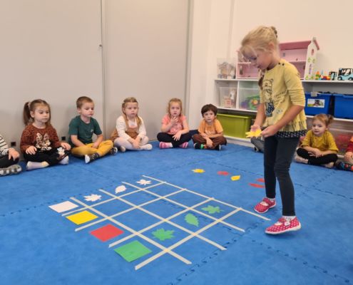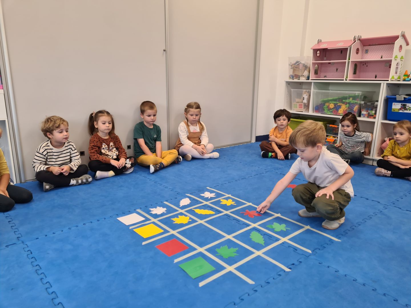 Jesienne zabawy- tańce integracyjne, kodowanie na dywanie, praca plastyczna