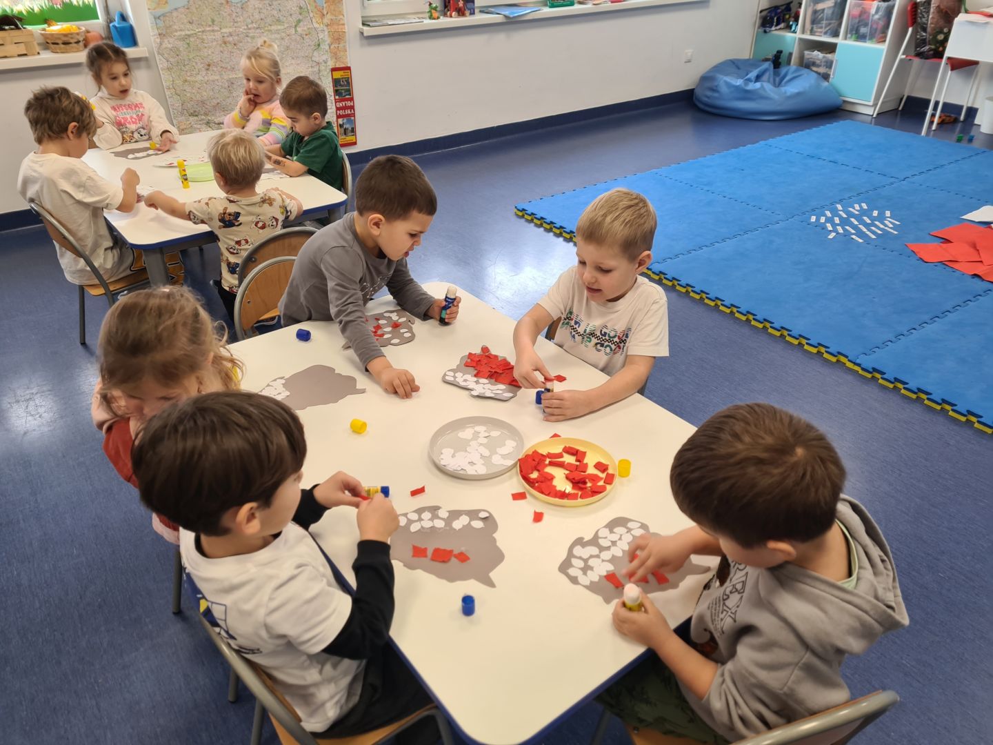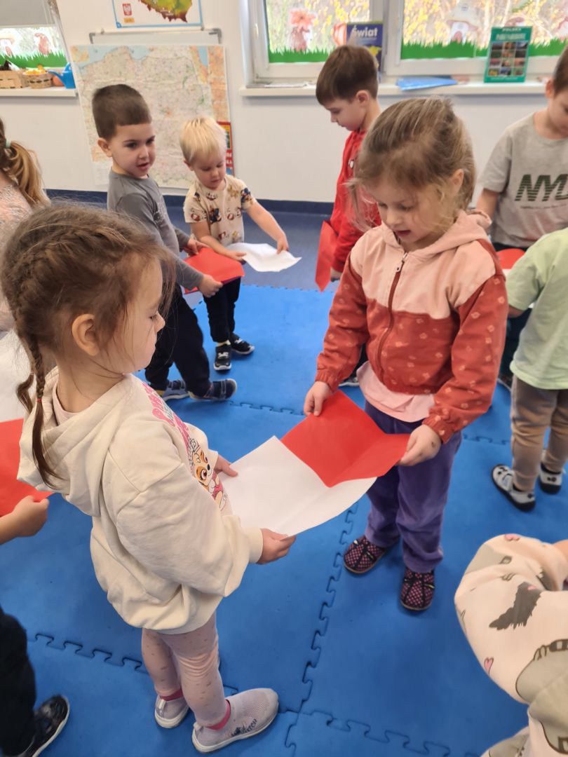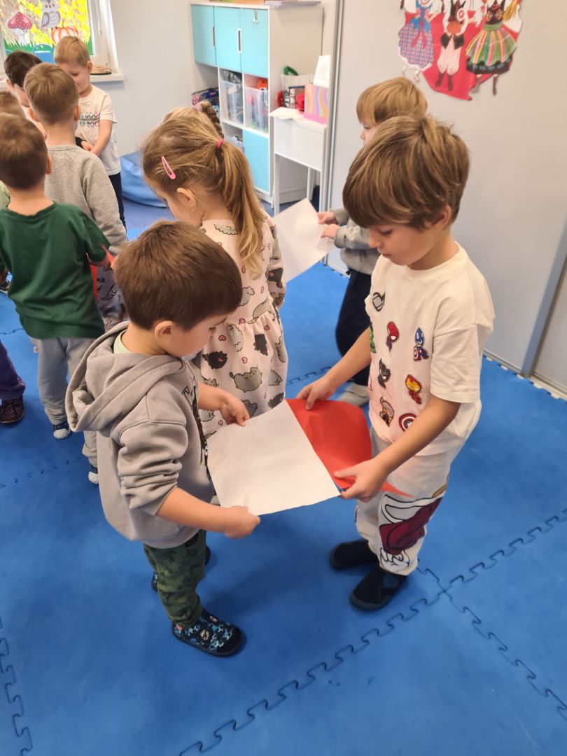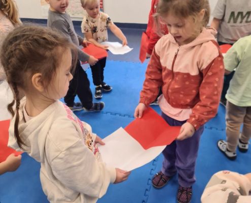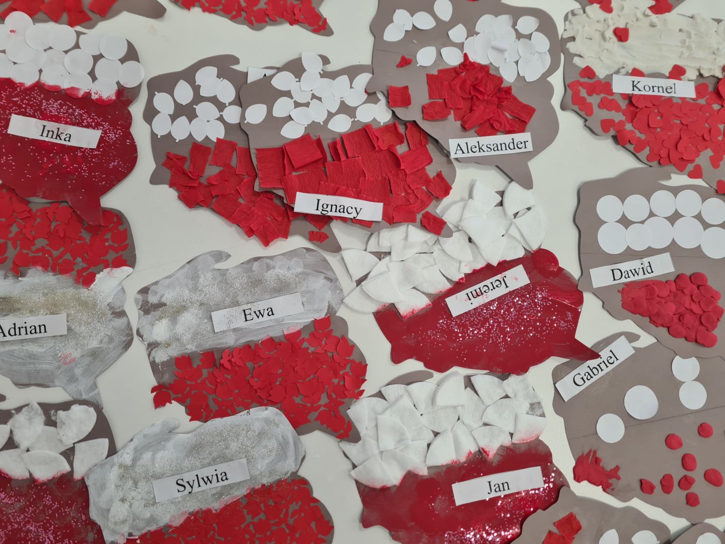 Praca plastyczna „Flaga Polski” wykonana techniką łączoną (naklejanie, stemplowanie, modelowanie)