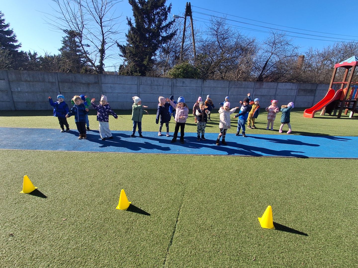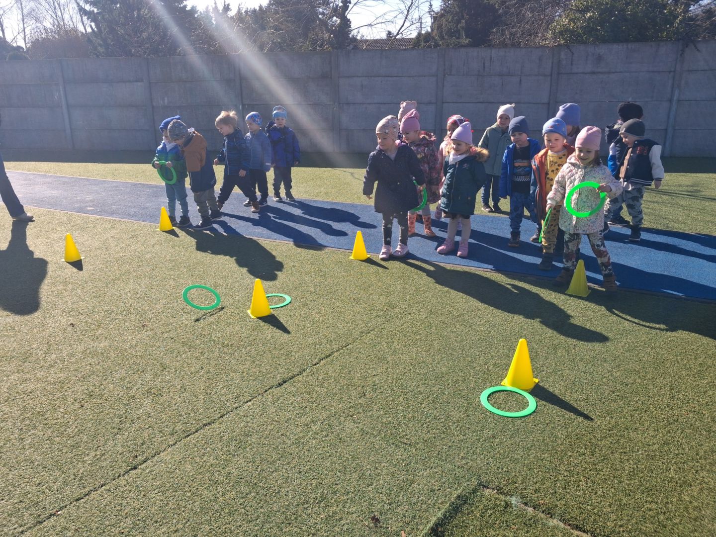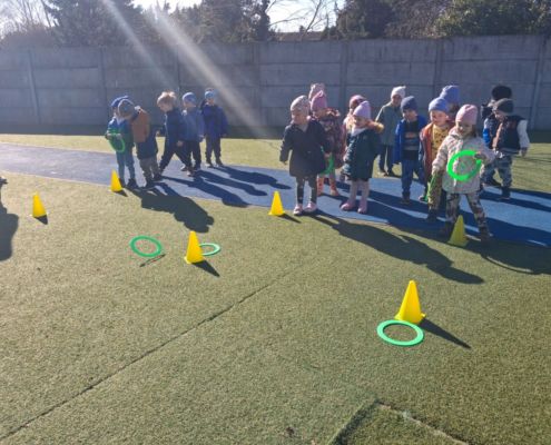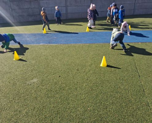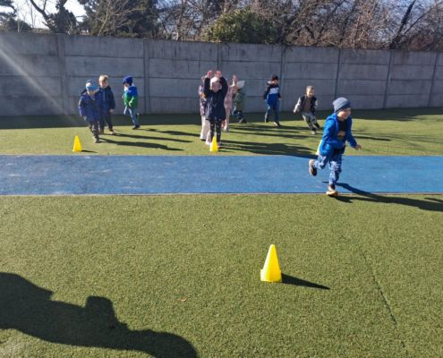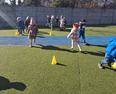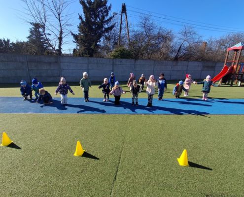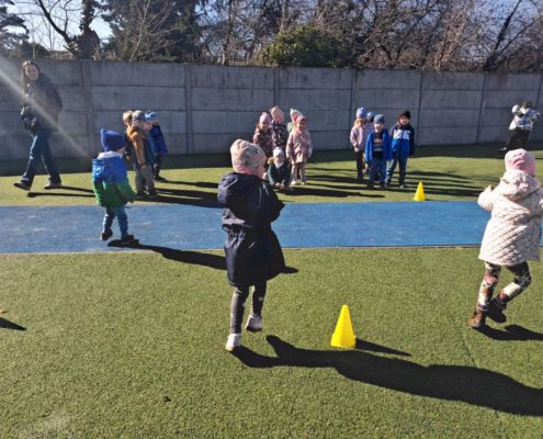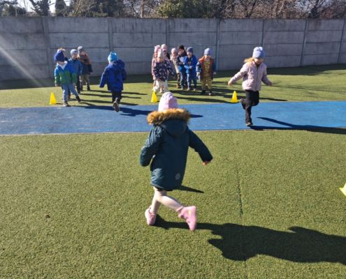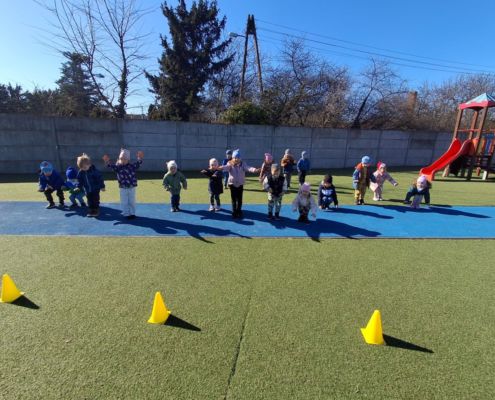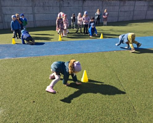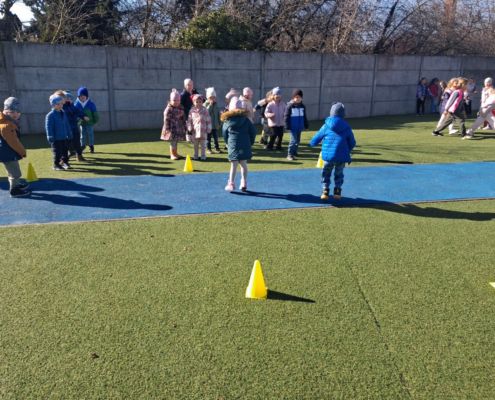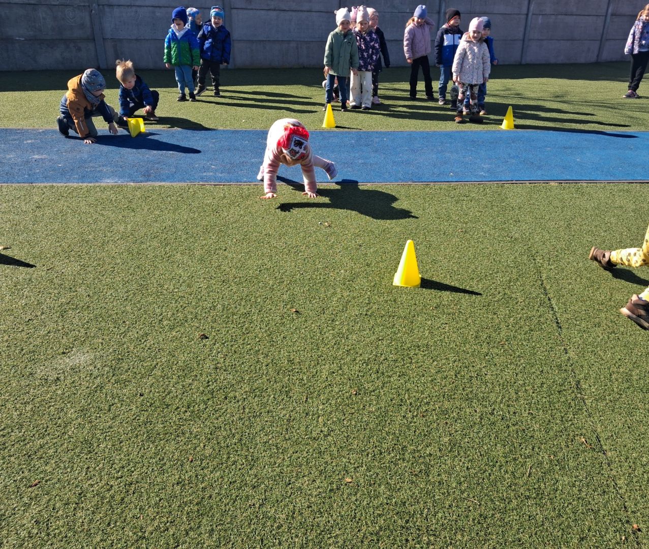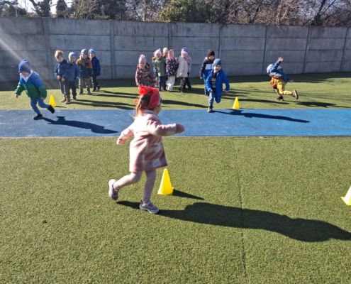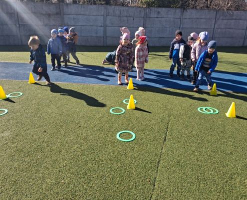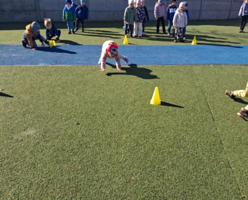 Zabawy ruchowe na świeżym powietrzu z elementami rywalizacji.