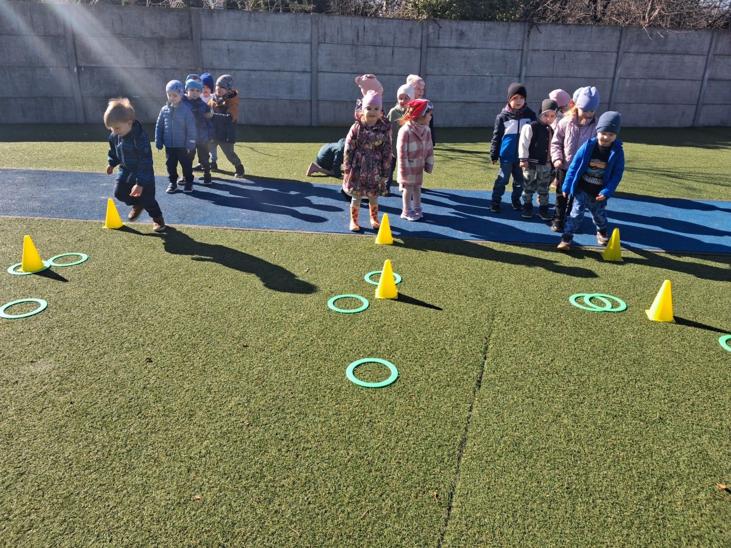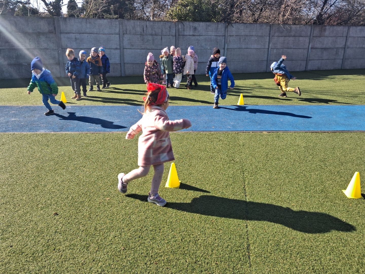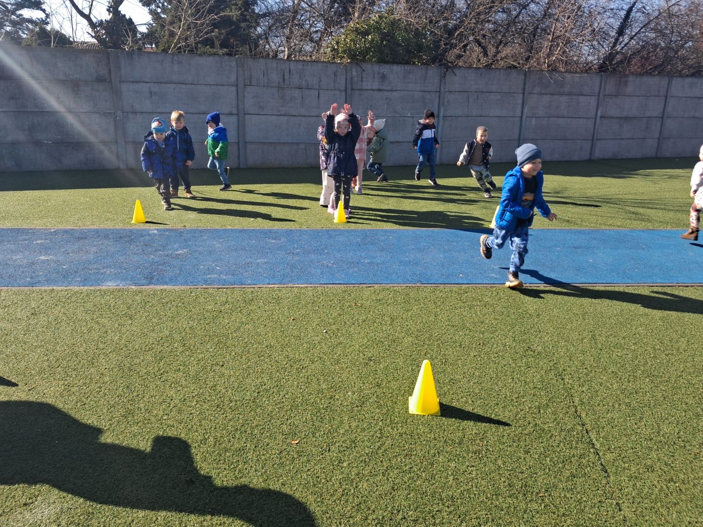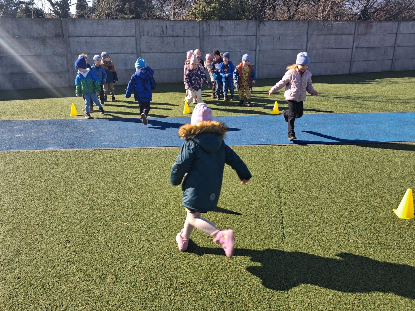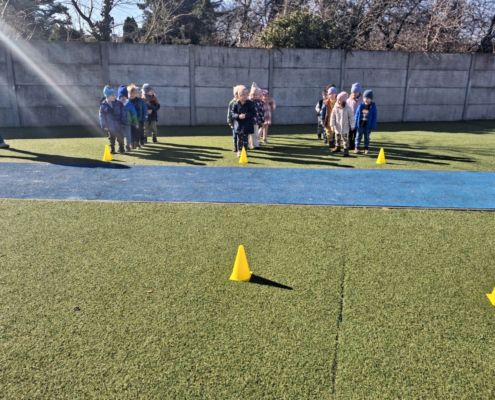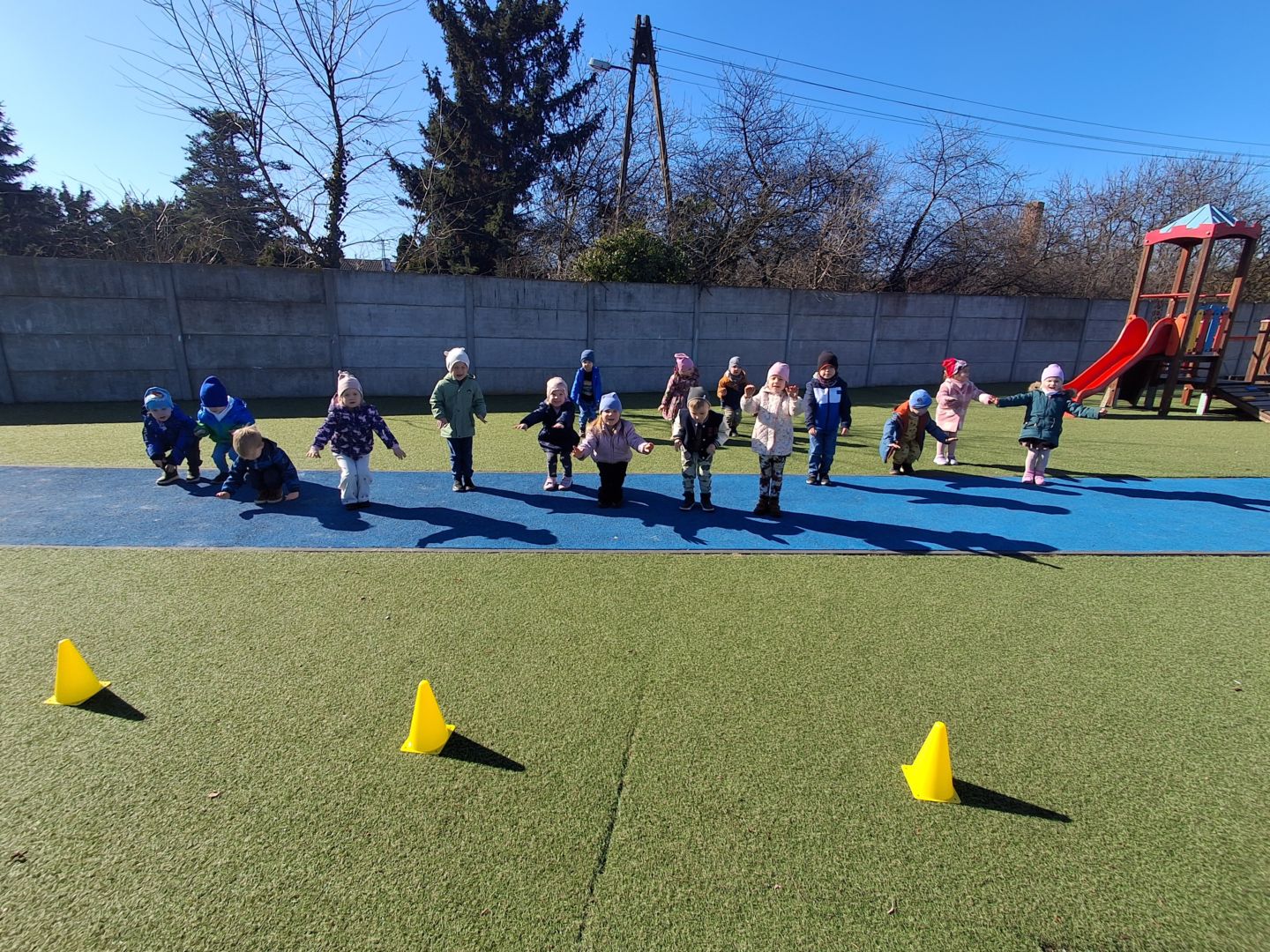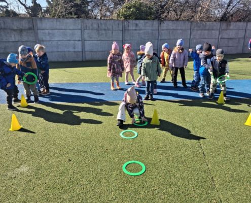 Zabawy ruchowe na świeżym powietrzu z elementami rywalizacji.