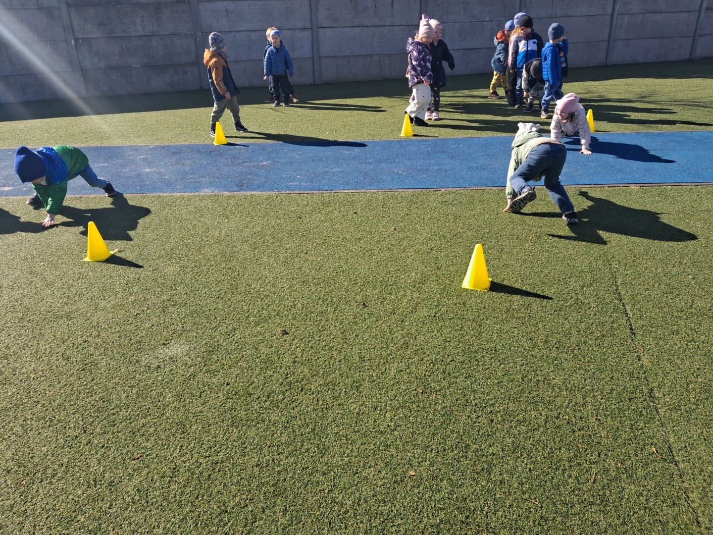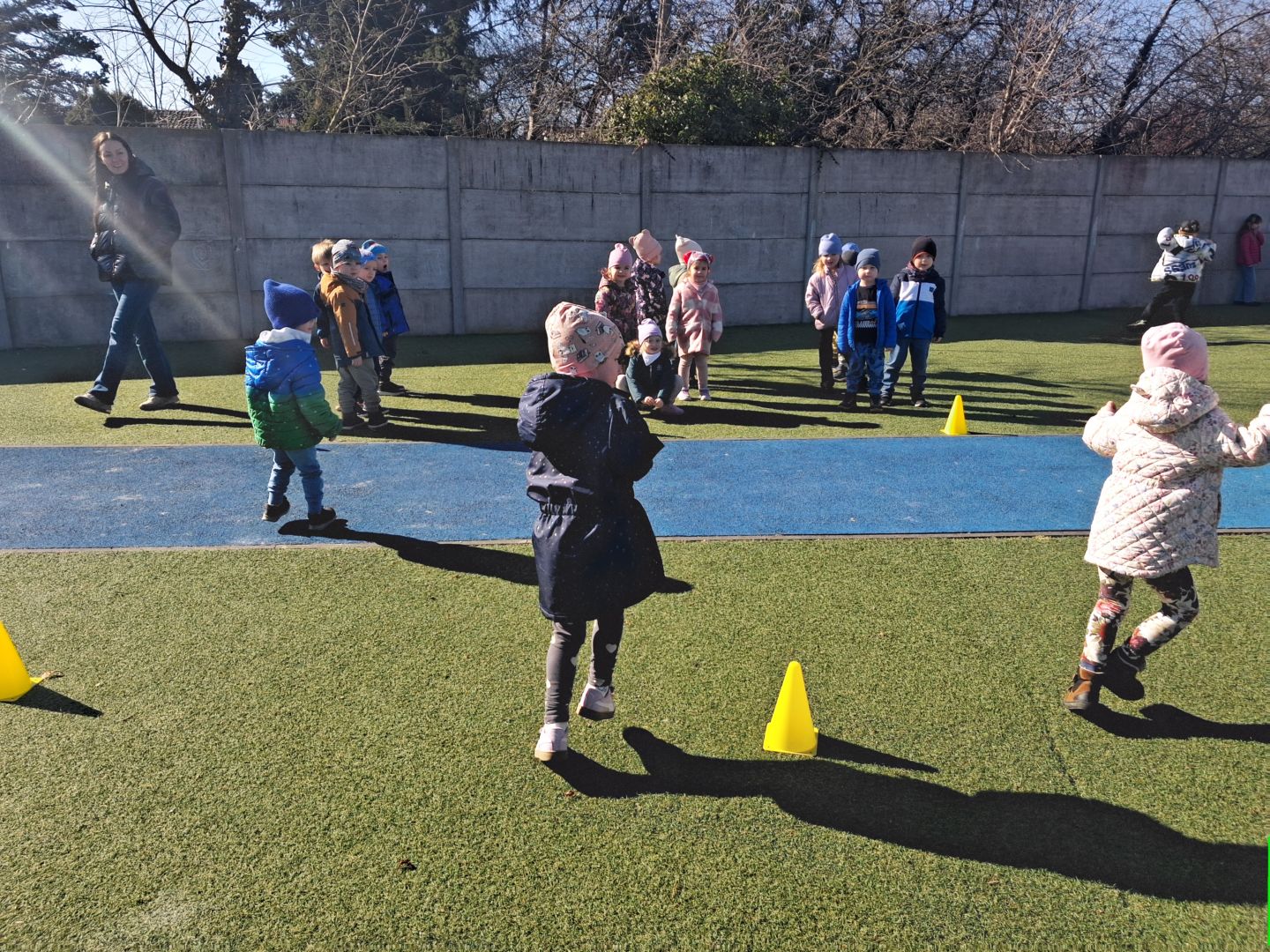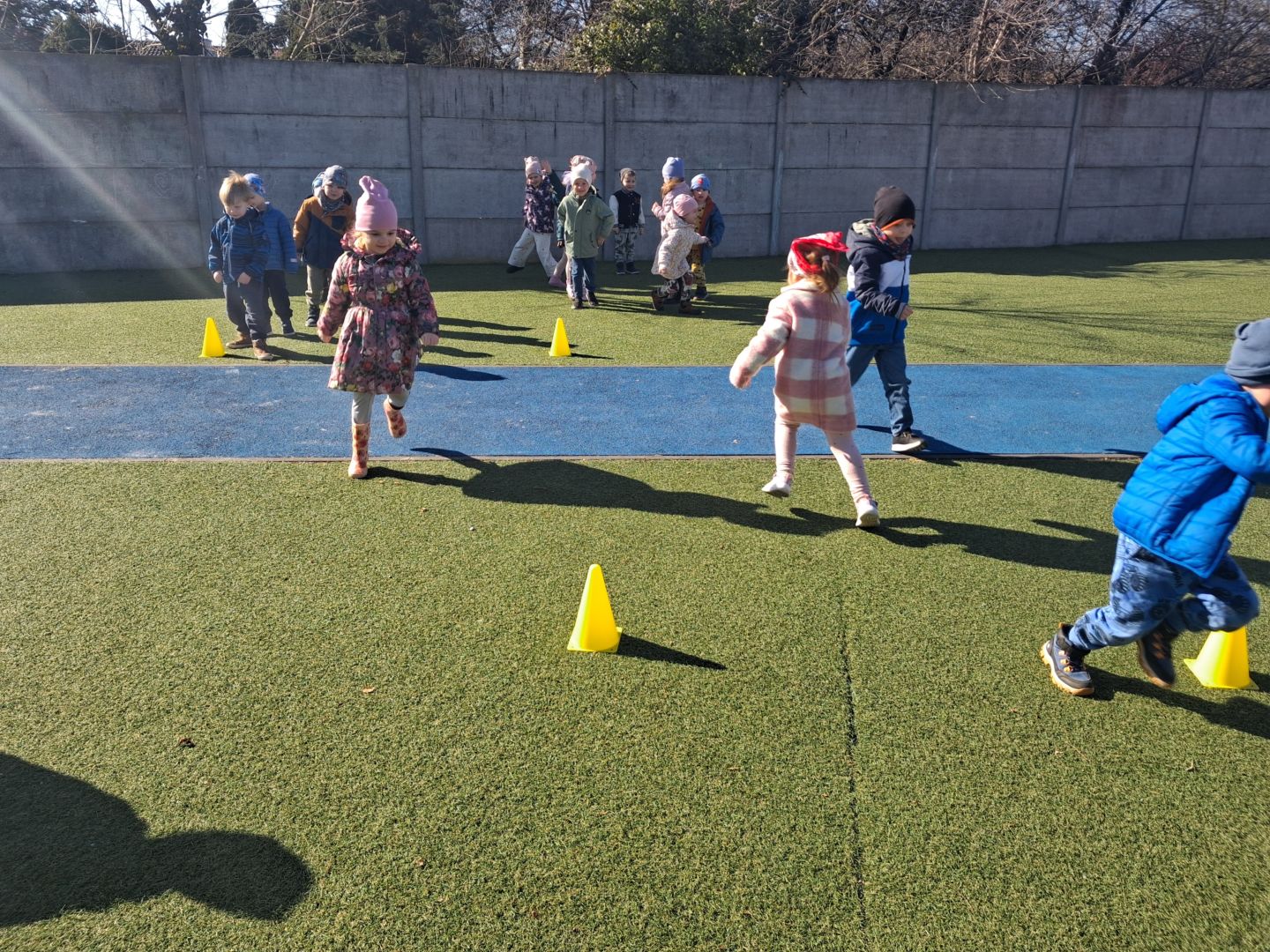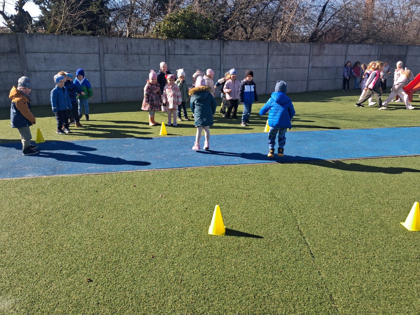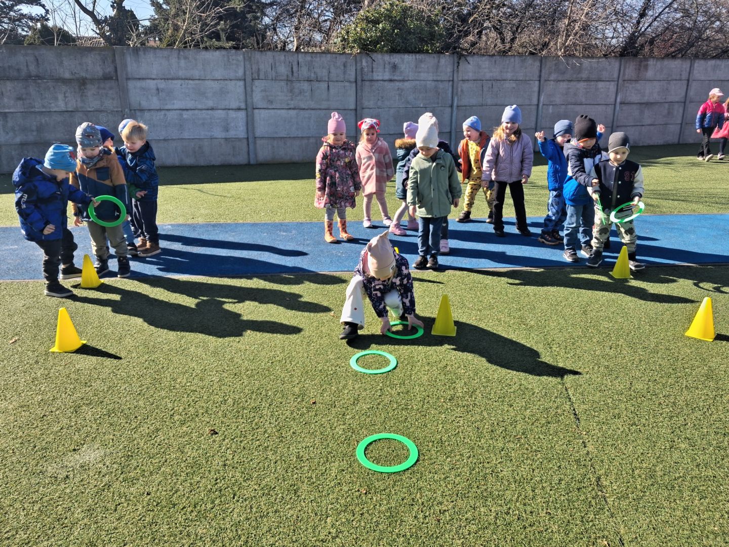 Zabawy ruchowe na świeżym powietrzu z elementami rywalizacji.