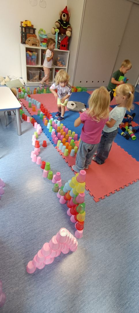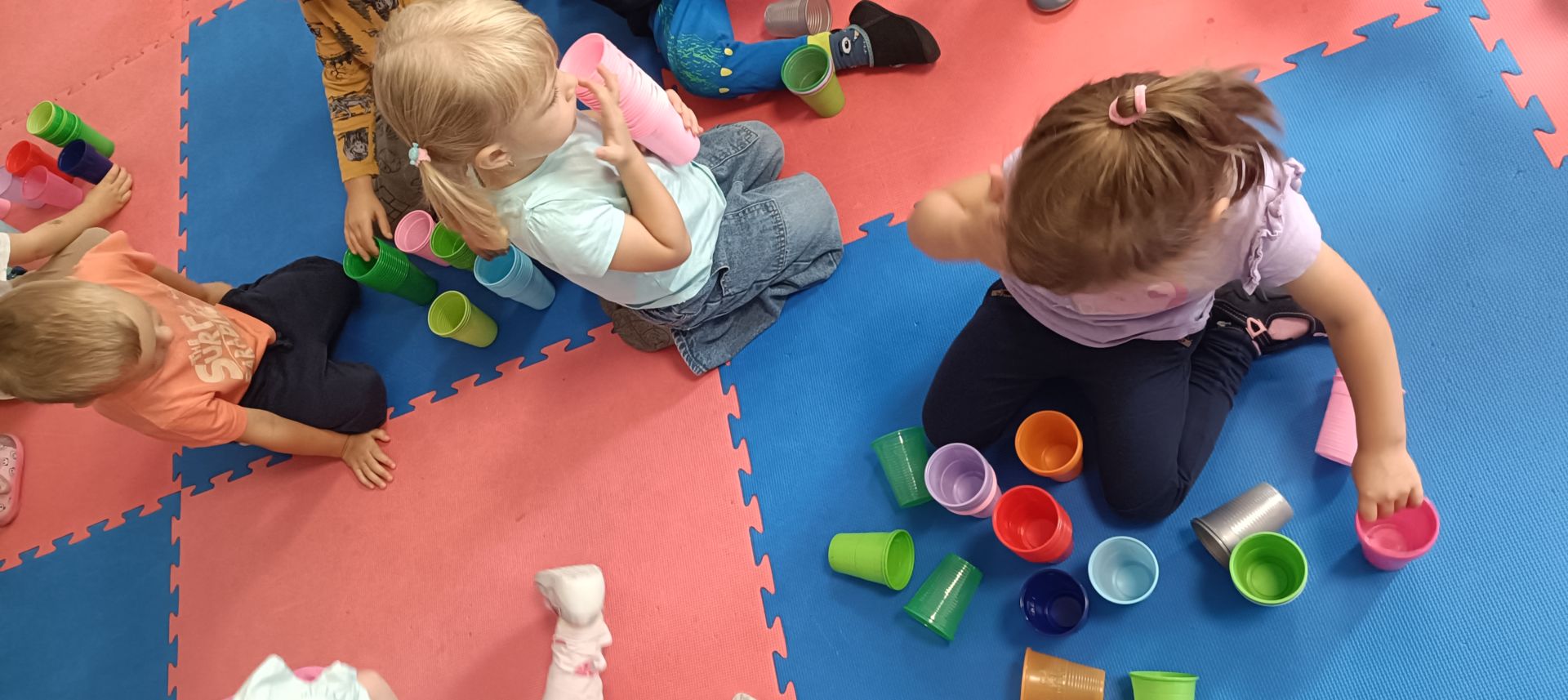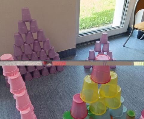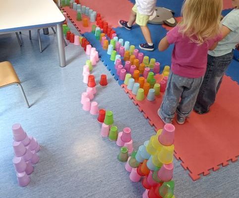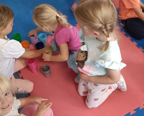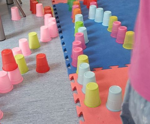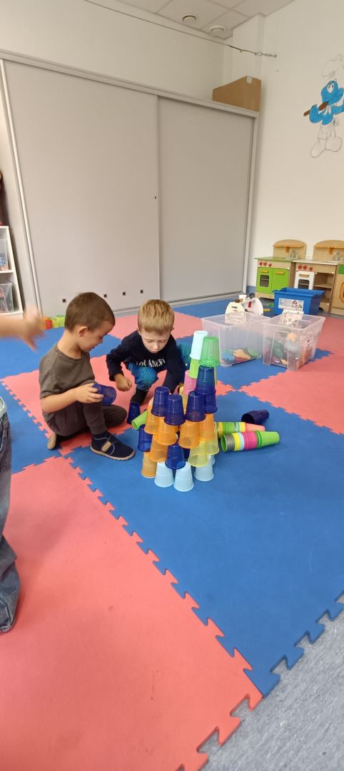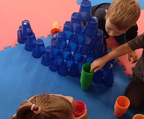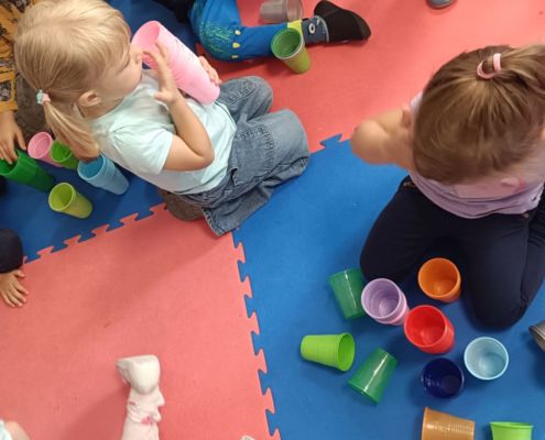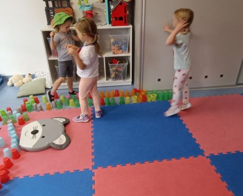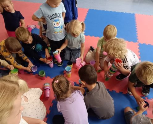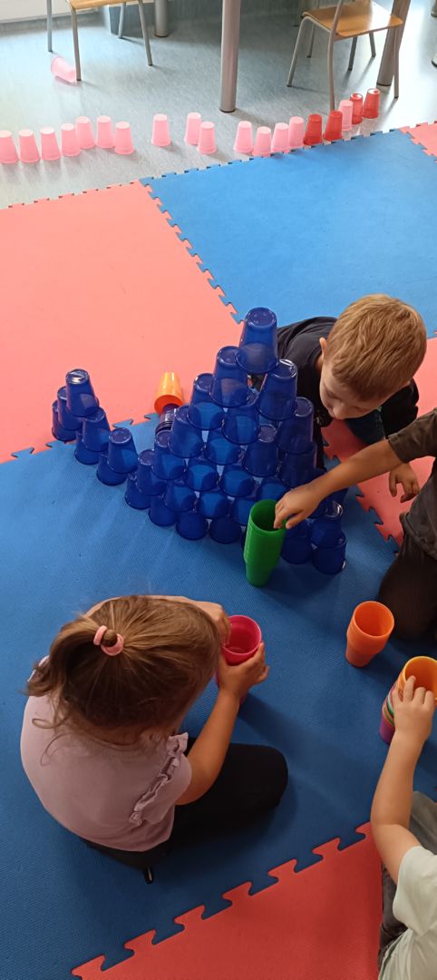 Podczas dzisiejszych zajęć wykorzystaliśmy kolorowe kubeczki, które pomagały nas w określaniu położenia: z przodu, z tyłu, obok,;