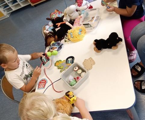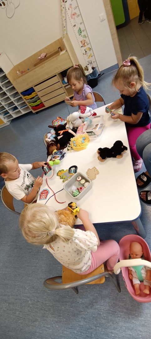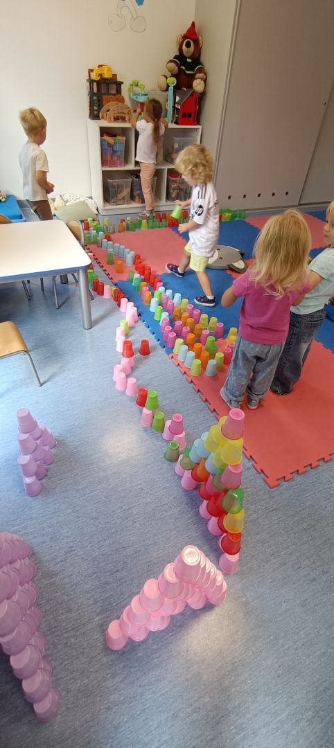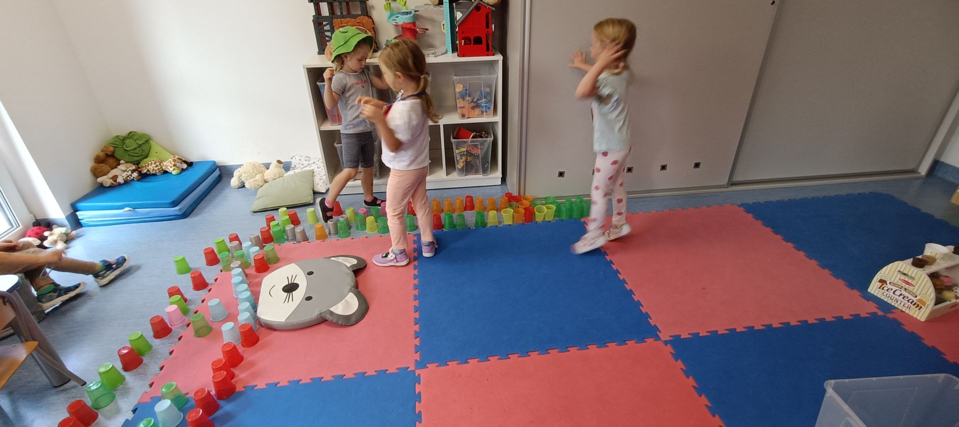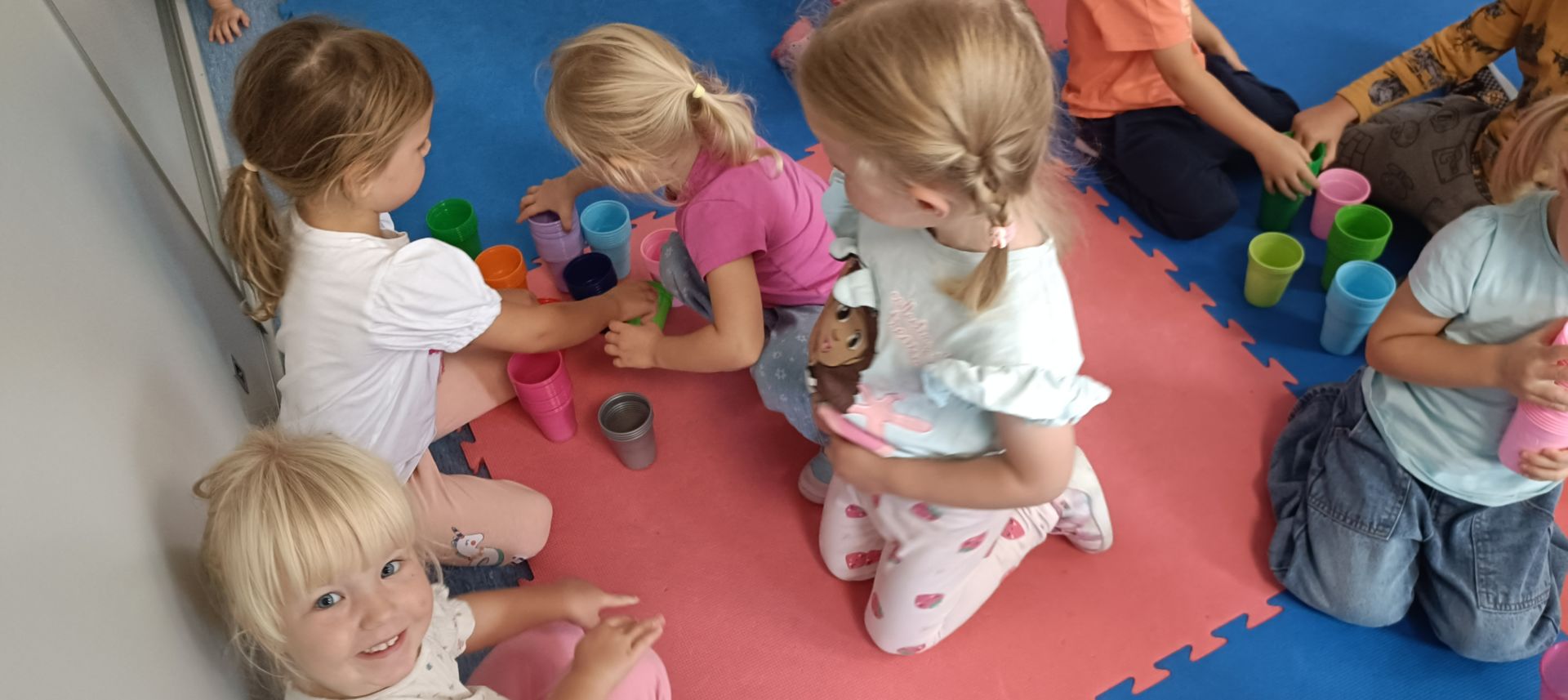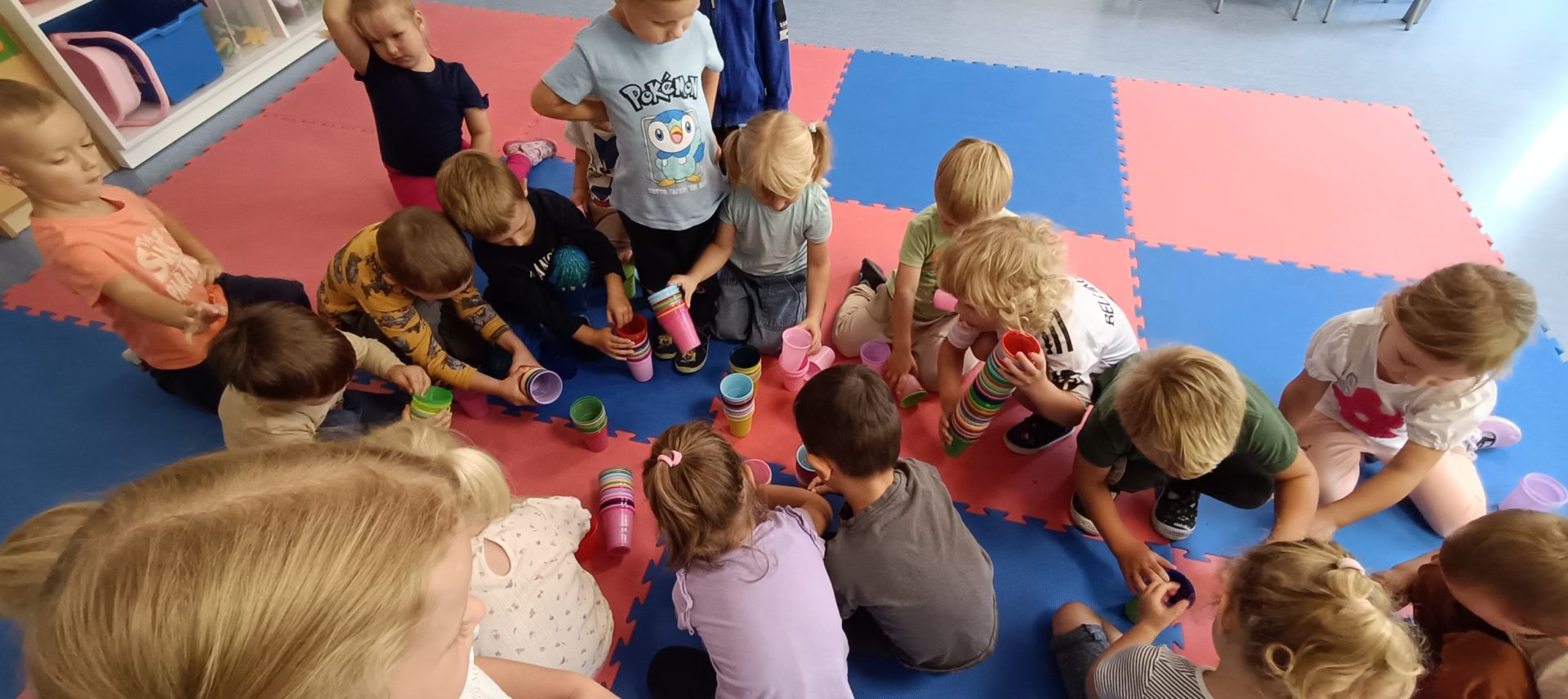 Podczas dzisiejszych zajęć wykorzystaliśmy kolorowe kubeczki, które pomagały nas w określaniu położenia: z przodu, z tyłu, obok,;