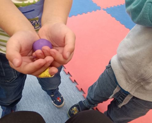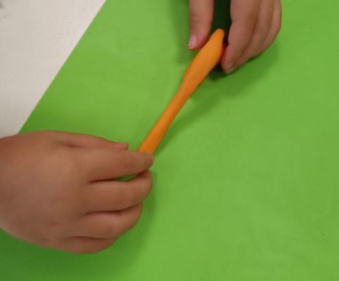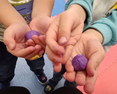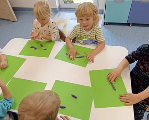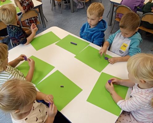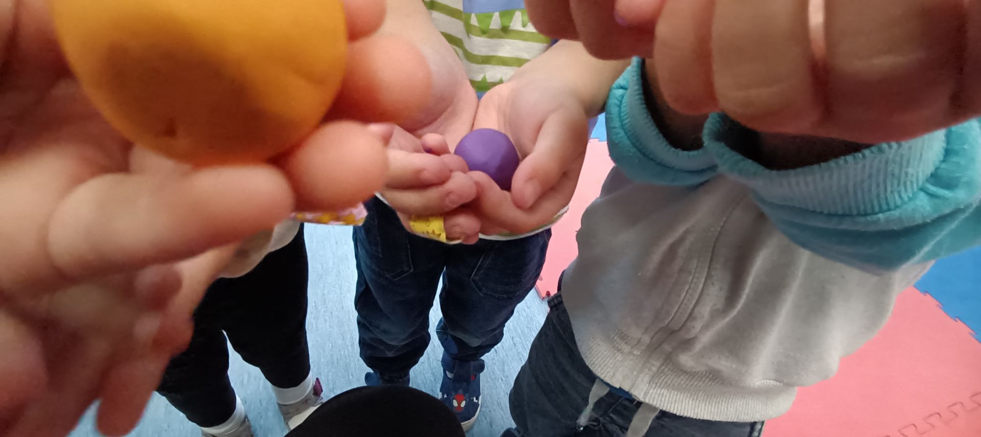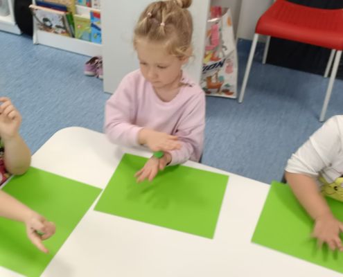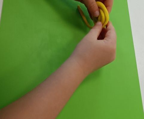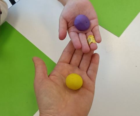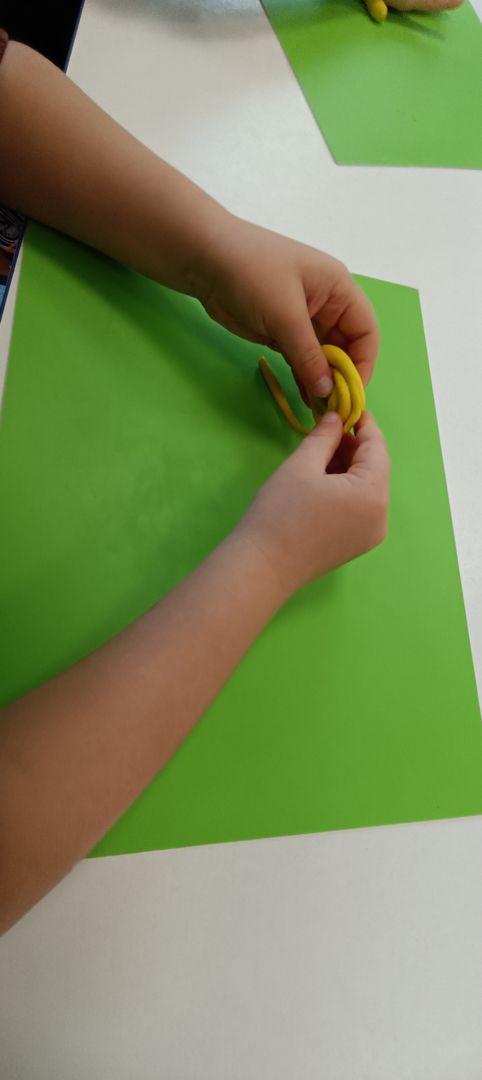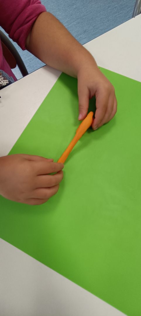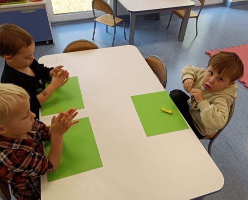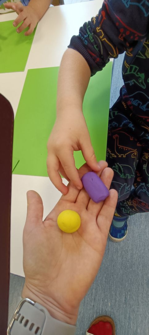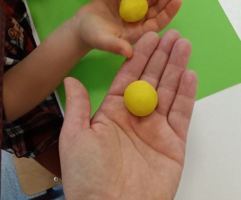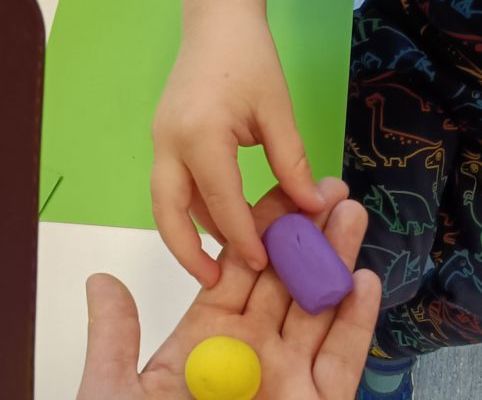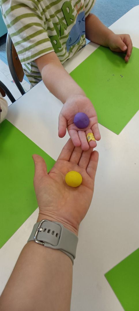 Podczas dzisiejszych zajęć ćwiczyliśmy motorykę małą poprzez naukę ugniatania plasteliny, tworzenia wałeczków oraz kulek.