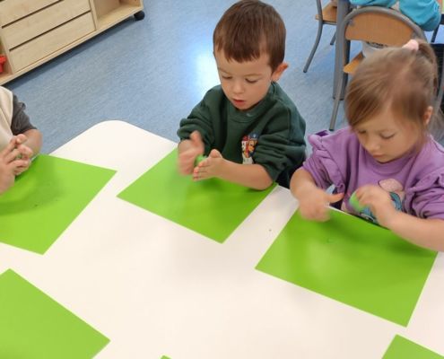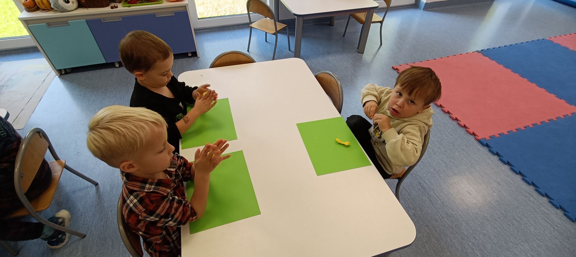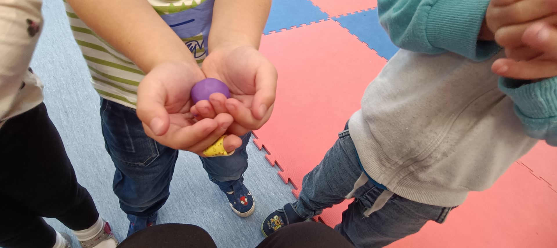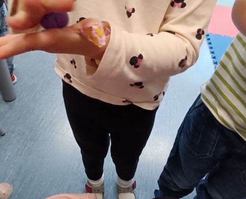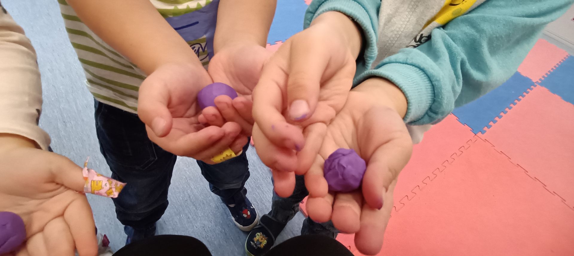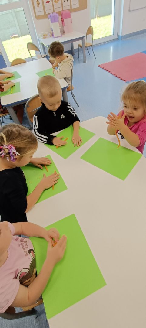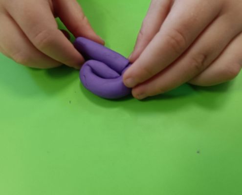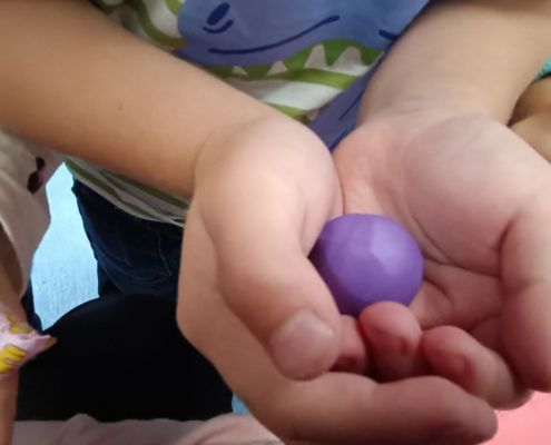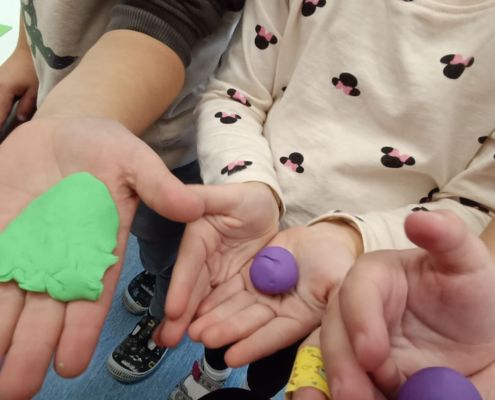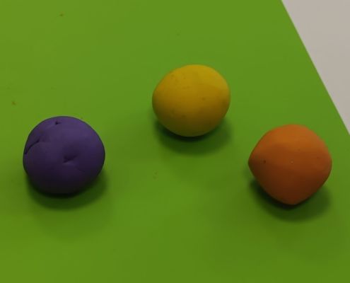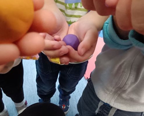 Podczas dzisiejszych zajęć ćwiczyliśmy motorykę małą poprzez naukę ugniatania plasteliny, tworzenia wałeczków oraz kulek.