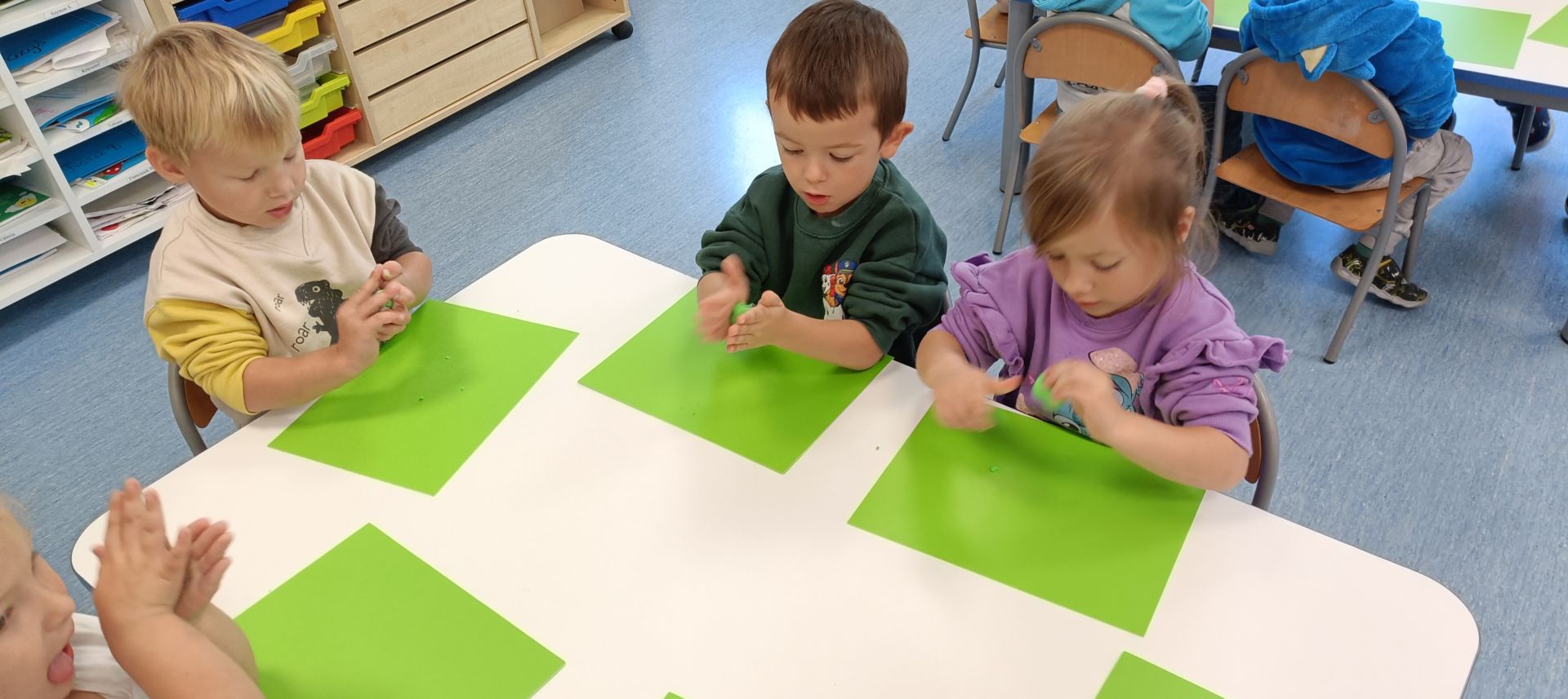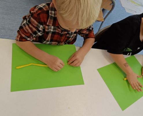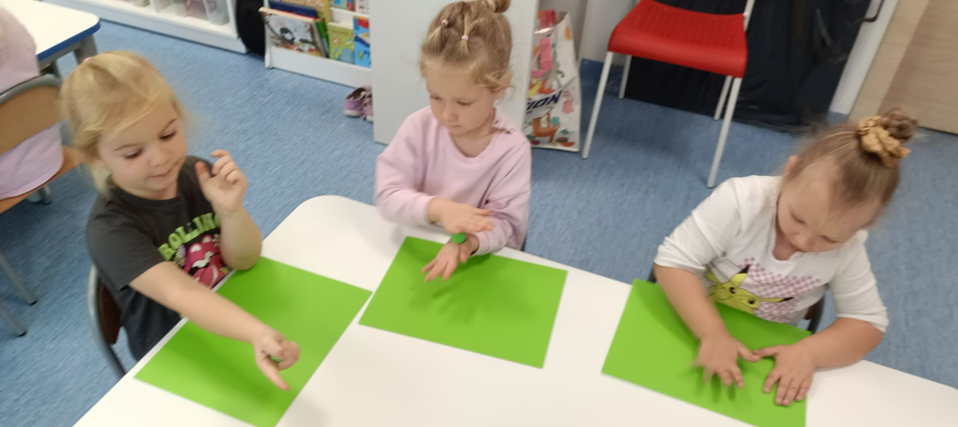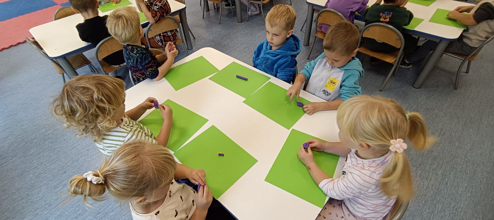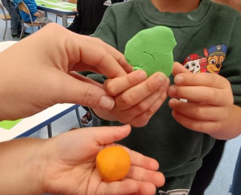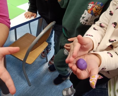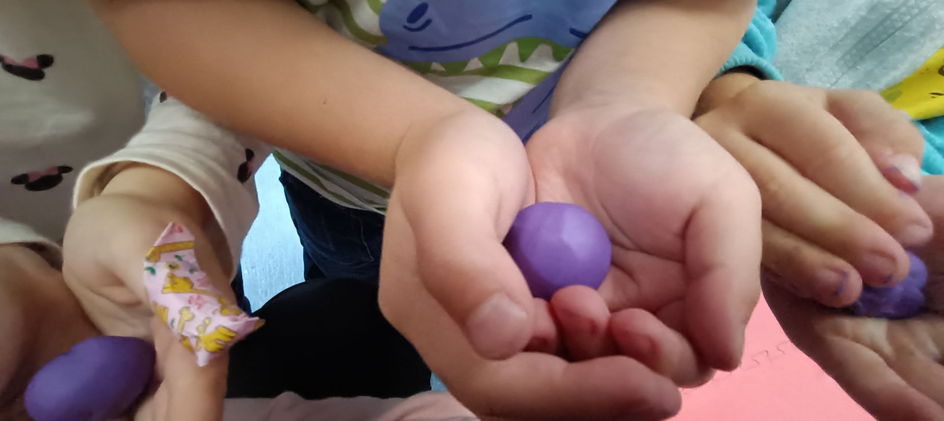Podczas dzisiejszych zajęć ćwiczyliśmy motorykę małą poprzez naukę ugniatania plasteliny, tworzenia wałeczków oraz kulek.