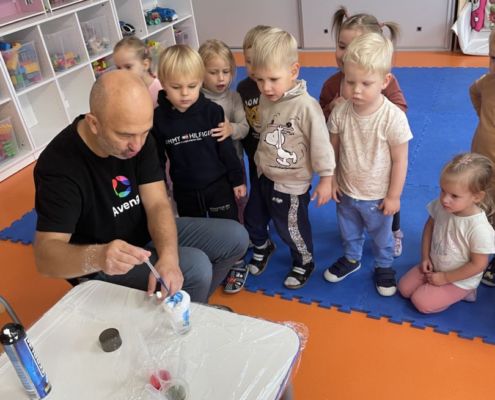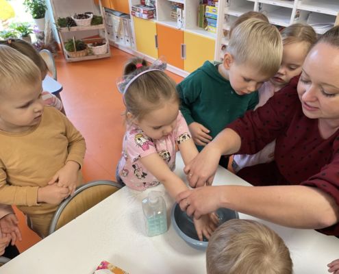 „Czyste rączki mamy” – Dzieci, bawiąc się brokatowymi „wirusami”, przekonały się, jak łatwo rozprzestrzeniają się zarazki i jak ważne jest dokładne mycie rąk, by skutecznie się ich pozbyć.