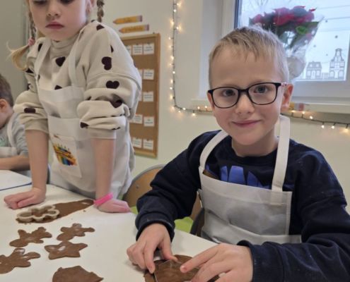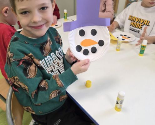 „Twórcy indiańskich figur” – praca z wykorzystaniem Wiatraka Matematycznego, rozpoznawanie i nazywanie figur geometrycznych. Tworzenie indiańskich pióropuszy, przyklejanie gotowych elementów, przeliczanie piór.