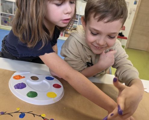 Malowanie pędzlem farbą do muzyki Antonio Vivaldiego „Jesień” wg własnej inwencji twórczej. Przyklejanie gotowego elementu – listka, poszukiwanie wizytówki z własnym imieniem