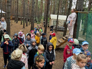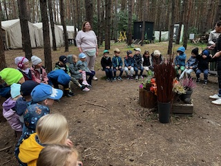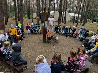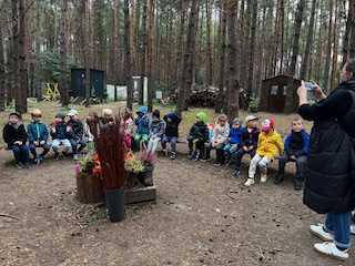 W poniedziałek 22 września,  a dokładnie w pierwszy Dzień Jesieni, Kraina Czerwona wraz z Krainą Fioletową rozpoczęła swoją pierwszą wycieczką w tym roku przedszkolnym. Dzieci wraz z Paniami wybrały się autokarem do Leśnej Bazy w Puszczykowie. Ogromny, otwarty, a do tego leśny teren pozwolił dzieciom cieszyć się świeżym powietrzem i przygotowanymi atrakcjami.
