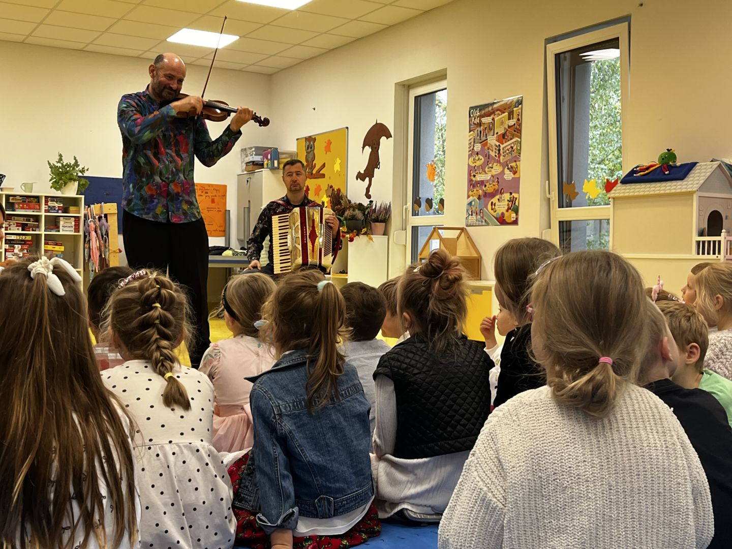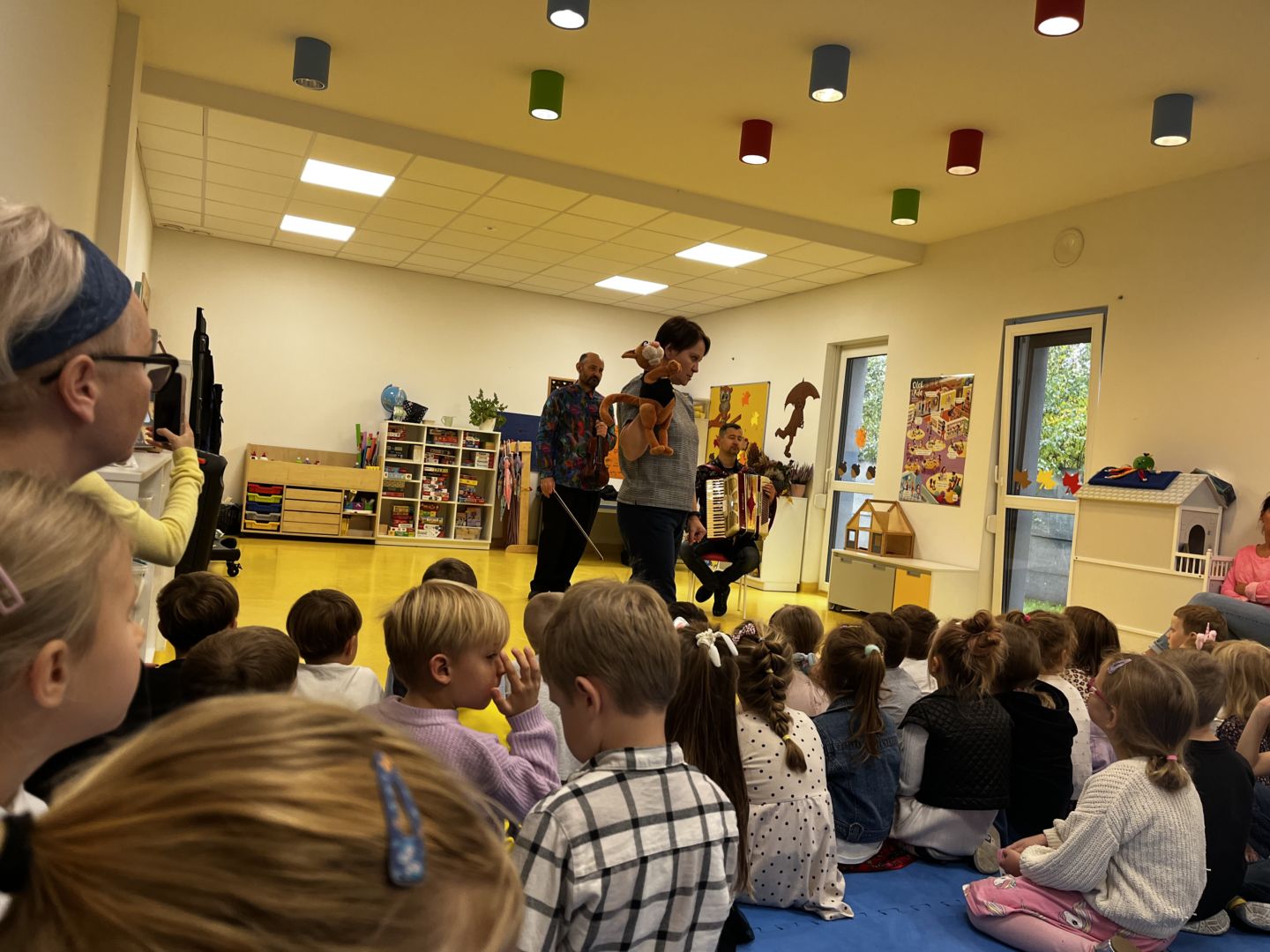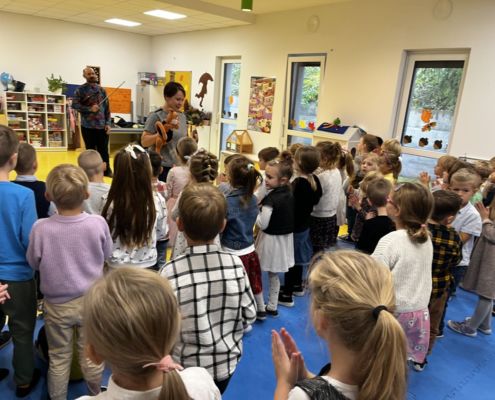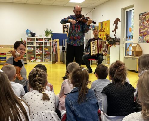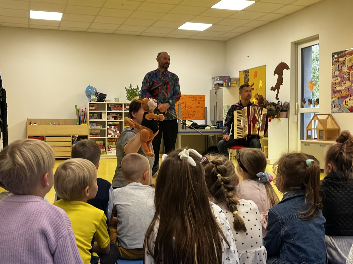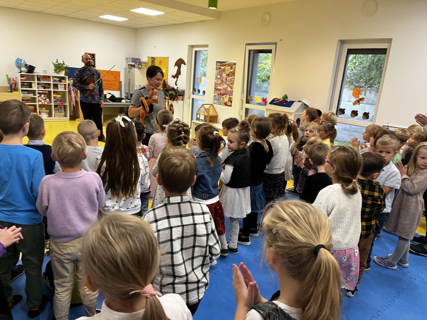 Dnia 8 października do naszego przedszkola poraź pierwszy w nowym roku przedszkolnym przybył naszulubiony Kotek Tralalotek. Jego występ nosił nazwę „Kiedy skrzypki grają”Podczas występu muzyczny kotek opowiedział nam jak powstają skrzypce oraz kto je wykonuje. Dzieci odkryły co oznaczę „drapanie skrzypiec „ oraz jak brzmią dźwięki zwierzać leśnych. To była niesamowita przygoda, odkrywać z Kotkiem dźwięki naszych leśnych przyjaciół.