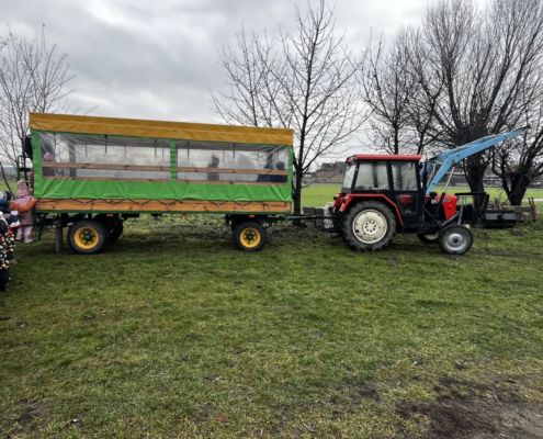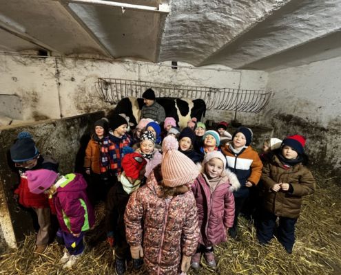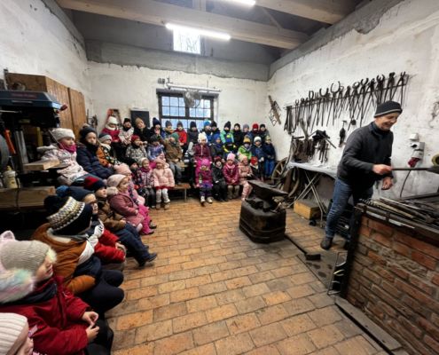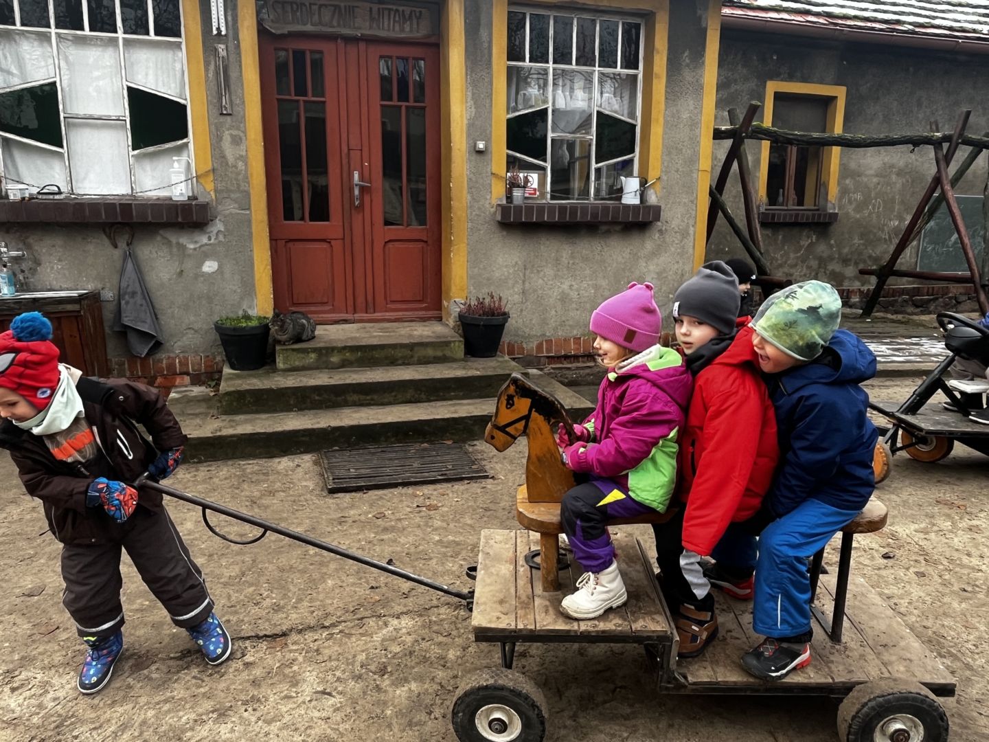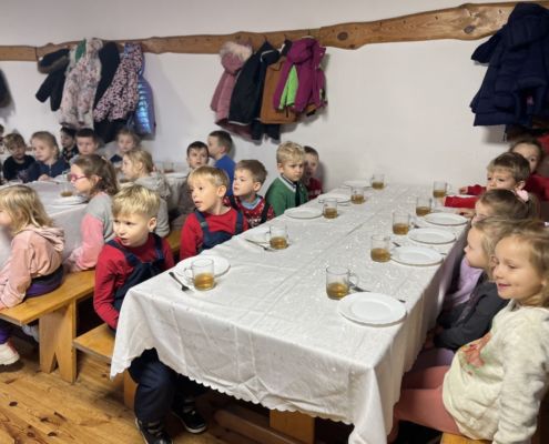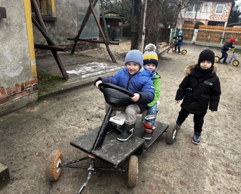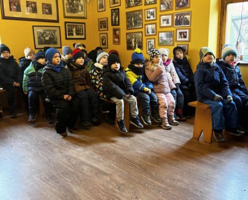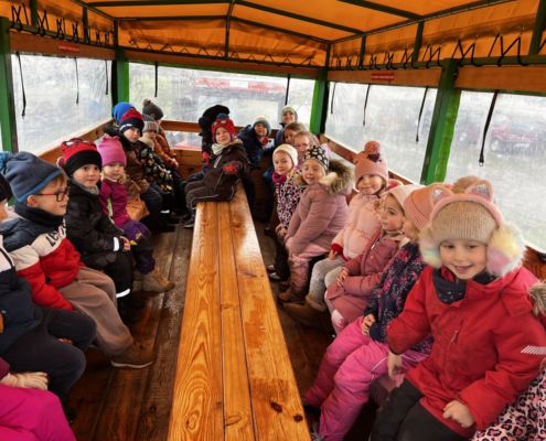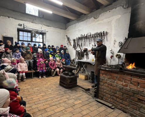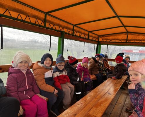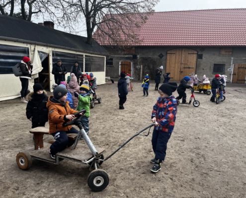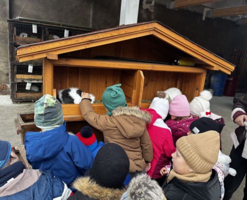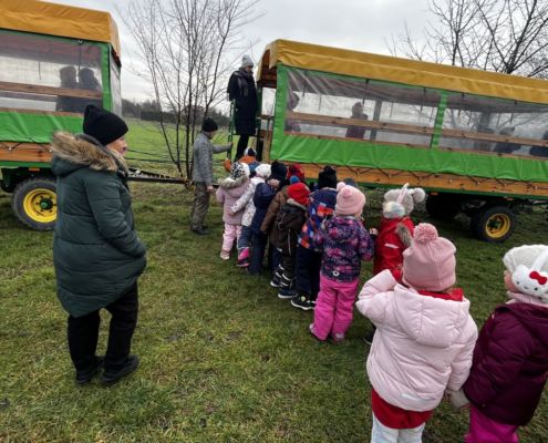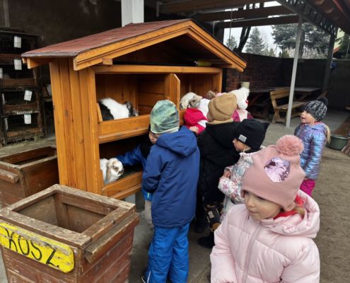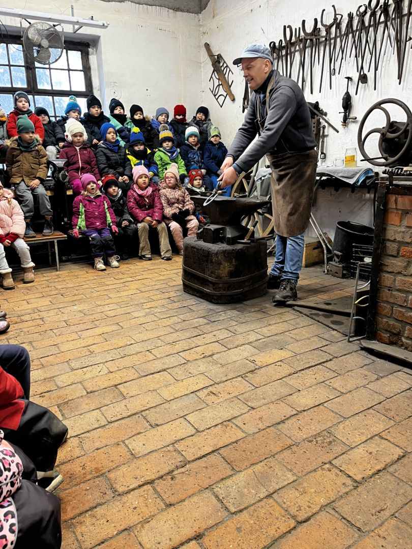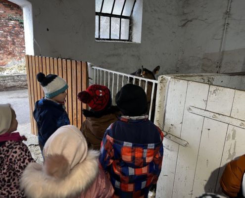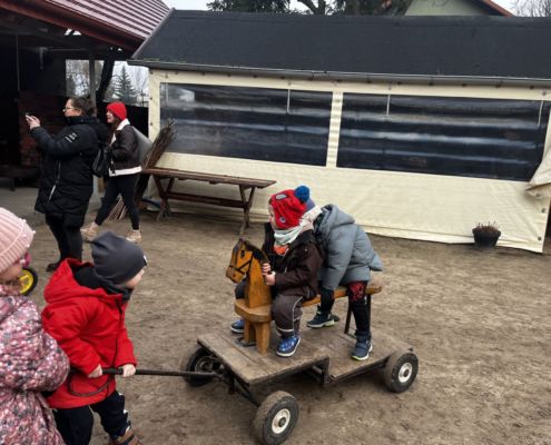 Kraina czerwona, fioletowa i żółta grudzień przywitała niesamowita wycieczka do Kleczewa. Odwiedziliśmy Starą Chatę u Kowala. Dzieci przywitała ciepłą herbatą, kolorowe kanapki i przepyszne pierogi. Następnie na salę wszedł Mikołaj ze słodkościami. Cudowny Pan Krzysztof oprowadził nas po całym gospodarstwie pokazując wszystkim ich mieszkańców. Kozy, Krowy, króliki. Po napełnieniu brzuchów i ogrzaniu się dzieci mogły wybiegać się i skorzystać z atrakcji na świeżym powietrzu. Zabawy skończyły się przejażdżką traktorem i ciepłym posiłkiem przy ognisku. W trakcie naszej przygody dzieci zobaczyły jak kowal wyrabia podkowy oraz zwiedziły Starą Chatę. To była wyprawa pełną przygód.
