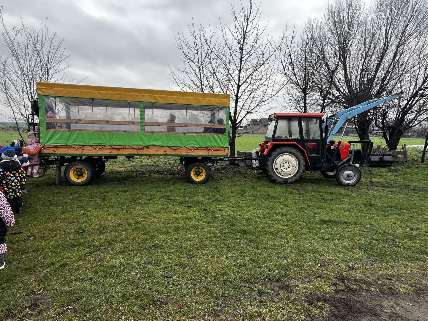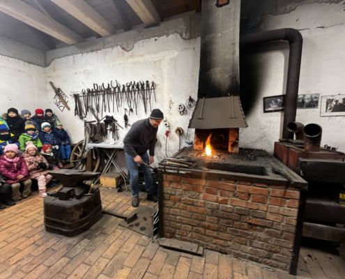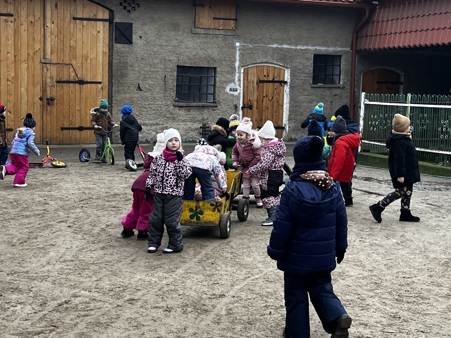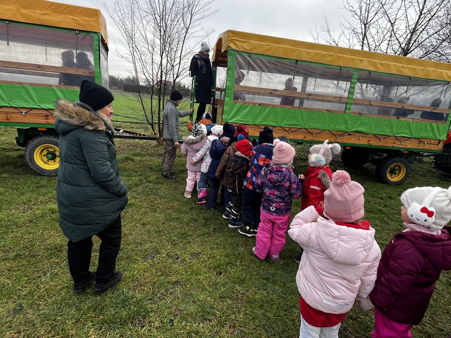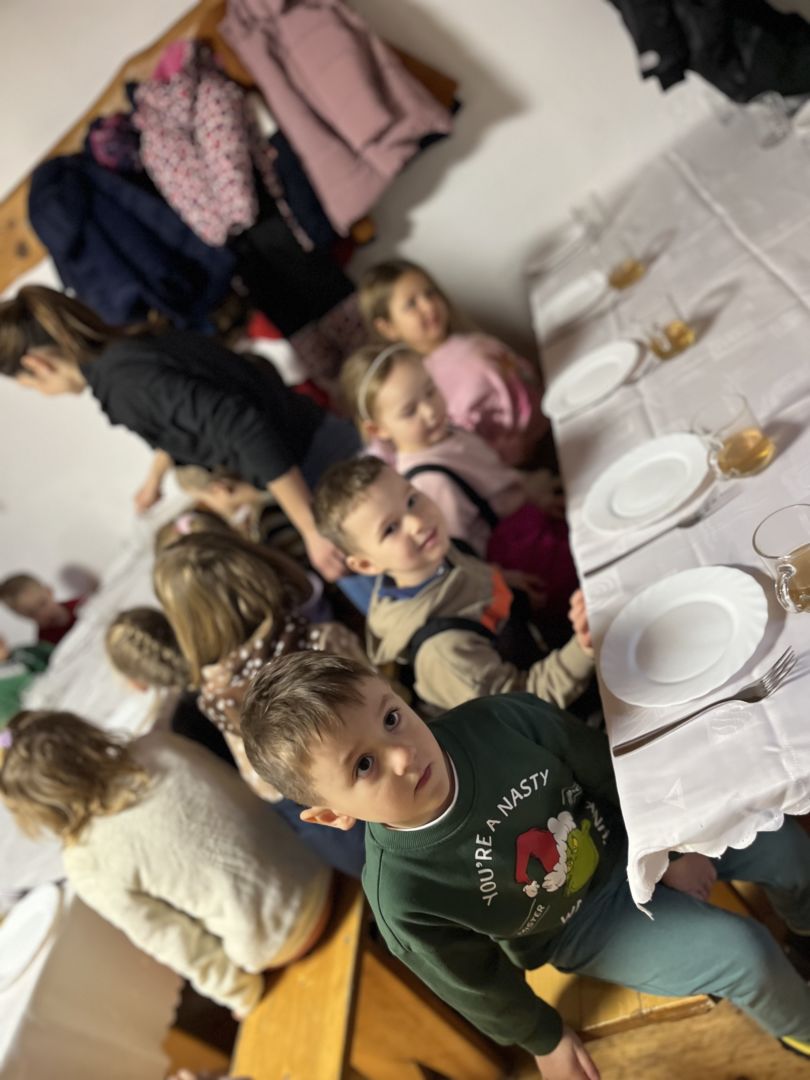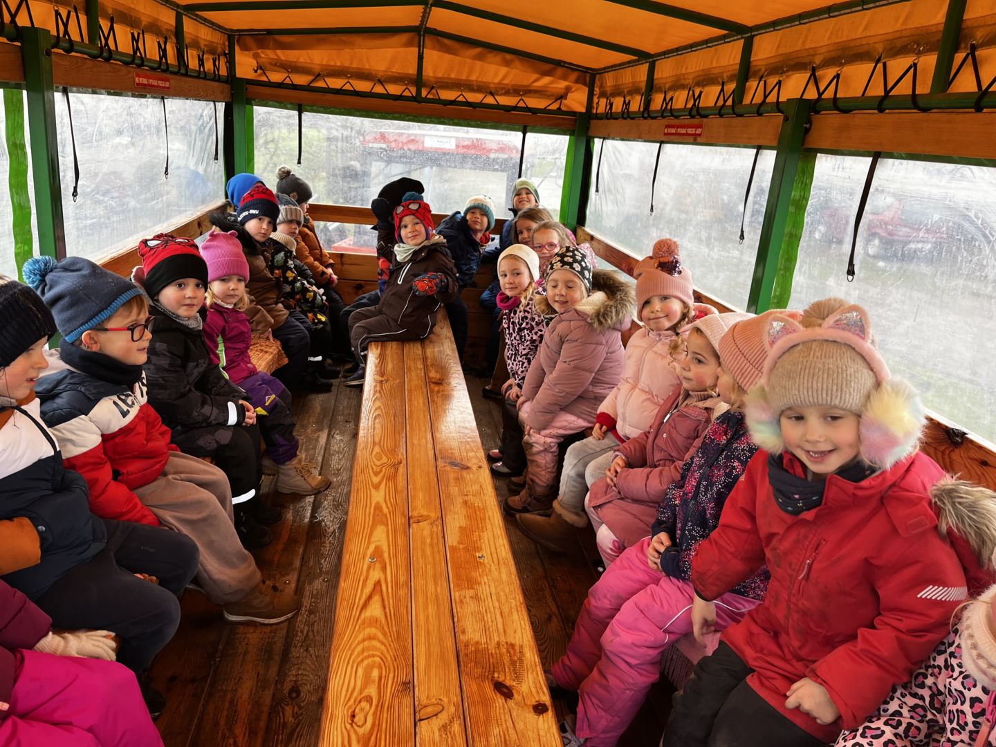 Kraina czerwona, fioletowa i żółta grudzień przywitała niesamowita wycieczka do Kleczewa. Odwiedziliśmy Starą Chatę u Kowala. Dzieci przywitała ciepłą herbatą, kolorowe kanapki i przepyszne pierogi. Następnie na salę wszedł Mikołaj ze słodkościami. Cudowny Pan Krzysztof oprowadził nas po całym gospodarstwie pokazując wszystkim ich mieszkańców. Kozy, Krowy, króliki. Po napełnieniu brzuchów i ogrzaniu się dzieci mogły wybiegać się i skorzystać z atrakcji na świeżym powietrzu. Zabawy skończyły się przejażdżką traktorem i ciepłym posiłkiem przy ognisku. W trakcie naszej przygody dzieci zobaczyły jak kowal wyrabia podkowy oraz zwiedziły Starą Chatę. To była wyprawa pełną przygód.