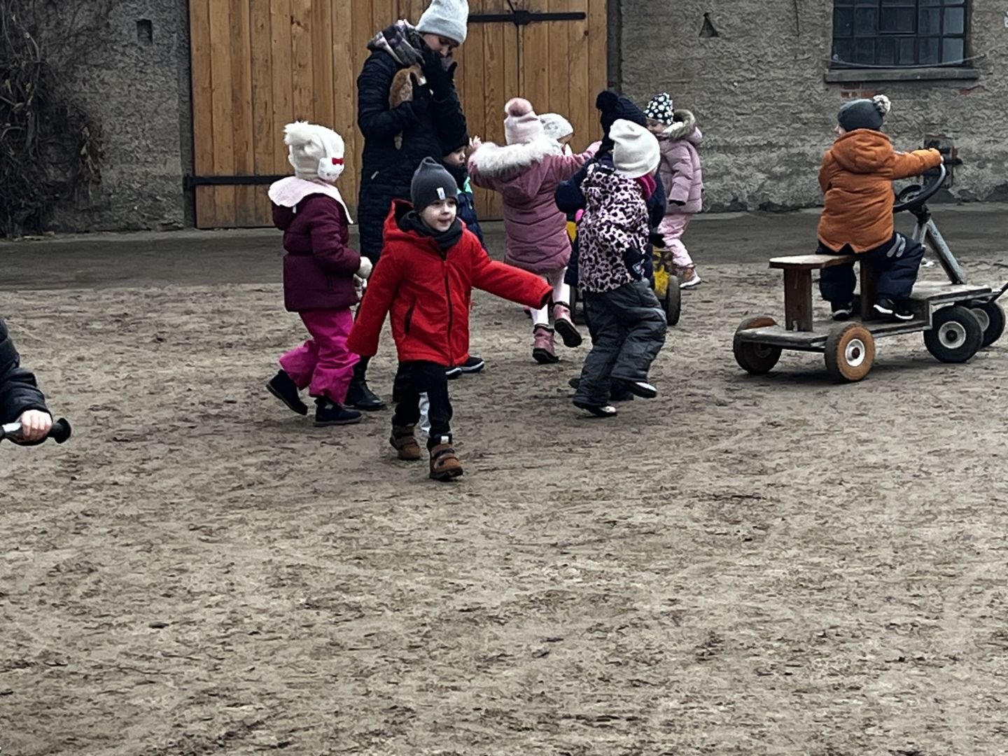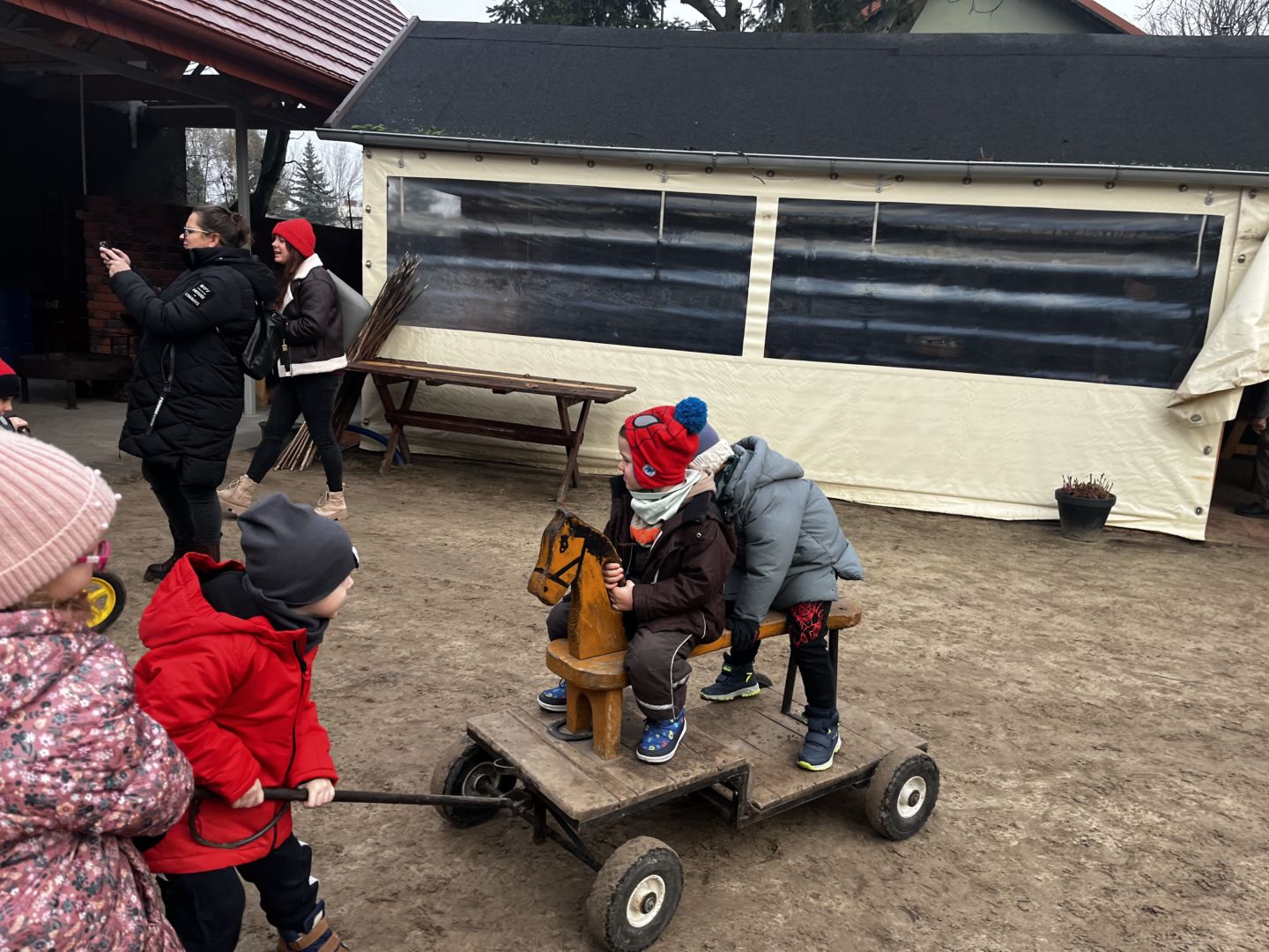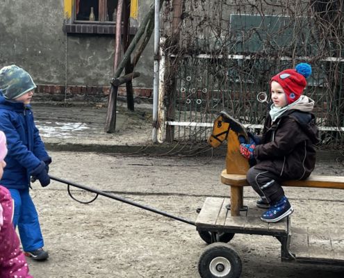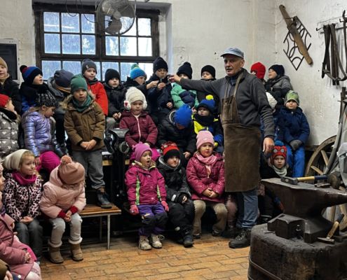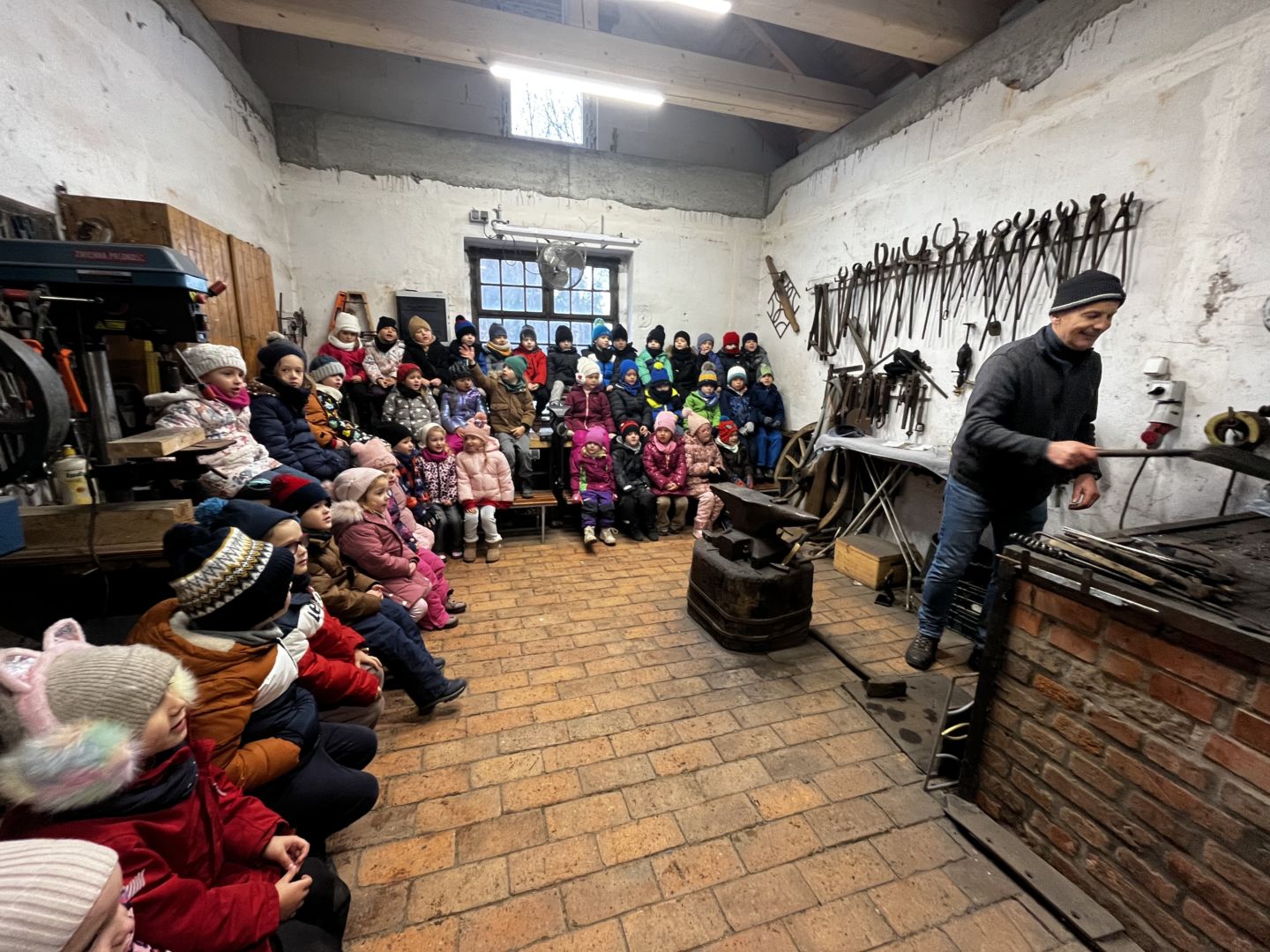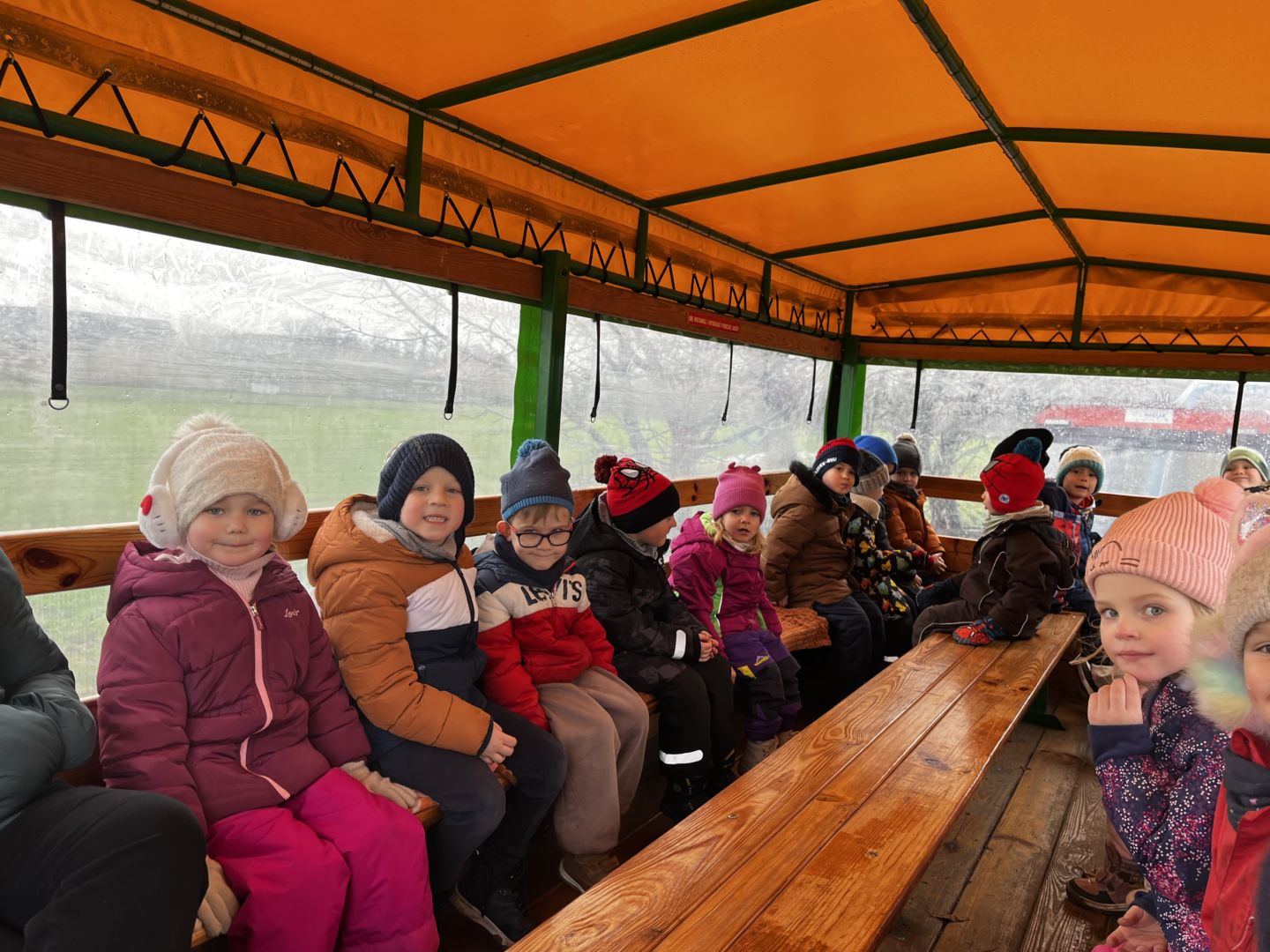 Kraina czerwona, fioletowa i żółta grudzień przywitała niesamowita wycieczka do Kleczewa. Odwiedziliśmy Starą Chatę u Kowala. Dzieci przywitała ciepłą herbatą, kolorowe kanapki i przepyszne pierogi. Następnie na salę wszedł Mikołaj ze słodkościami. Cudowny Pan Krzysztof oprowadził nas po całym gospodarstwie pokazując wszystkim ich mieszkańców. Kozy, Krowy, króliki. Po napełnieniu brzuchów i ogrzaniu się dzieci mogły wybiegać się i skorzystać z atrakcji na świeżym powietrzu. Zabawy skończyły się przejażdżką traktorem i ciepłym posiłkiem przy ognisku. W trakcie naszej przygody dzieci zobaczyły jak kowal wyrabia podkowy oraz zwiedziły Starą Chatę. To była wyprawa pełną przygód.