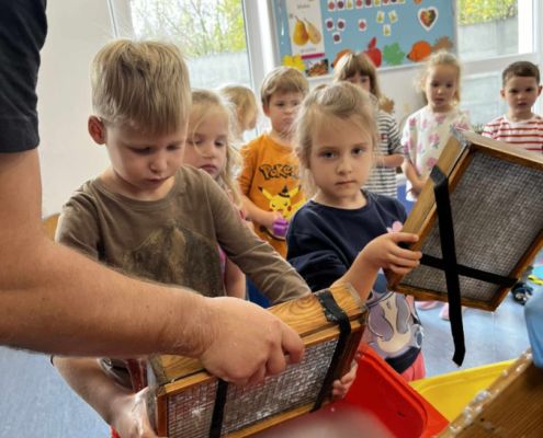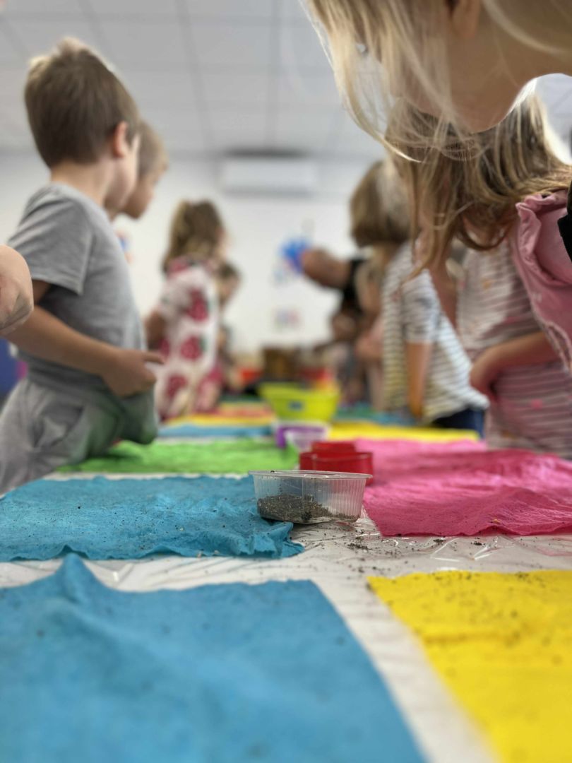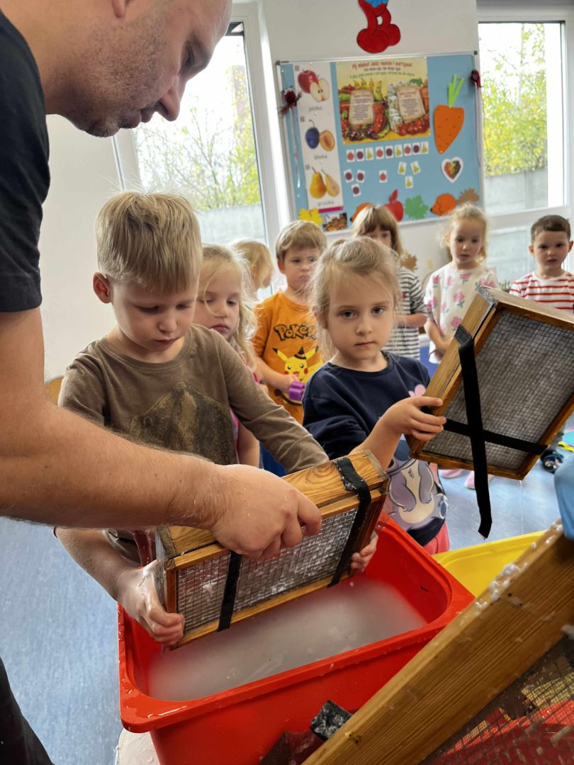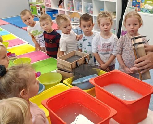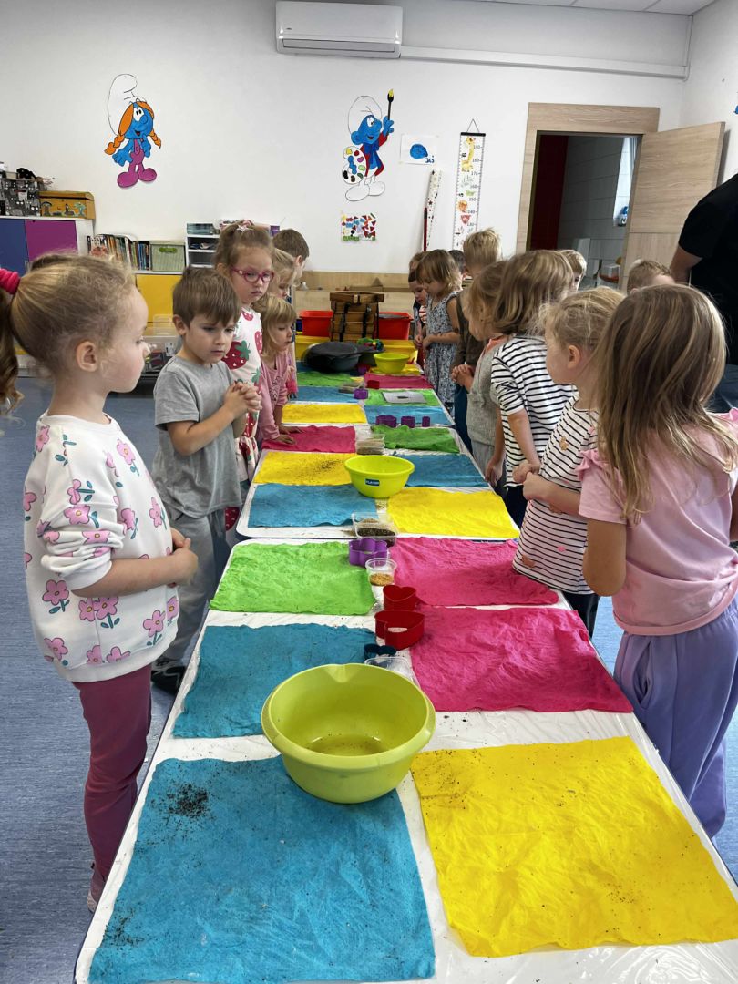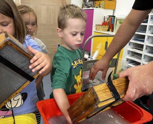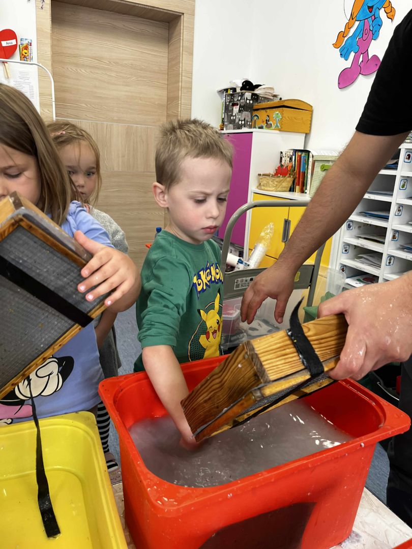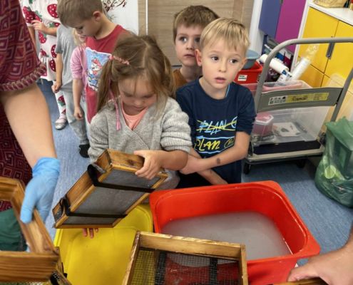 Dnia 22 października, przyjechała do nas Pracownia Edukacyjna Wiatrak. Pozwoliła nam przenieść się w krainę wynalazku i cofnąć o kilka epok wstecz. Niesamowite było to, że nasi mali odkrywcy sami zajęli się wyrabianiem papieru i ozdabianiem go. Dzieci nie mogły wyjść z podziwu, ze swoimi rękoma czerpali papier. To była niesamowita przygoda!